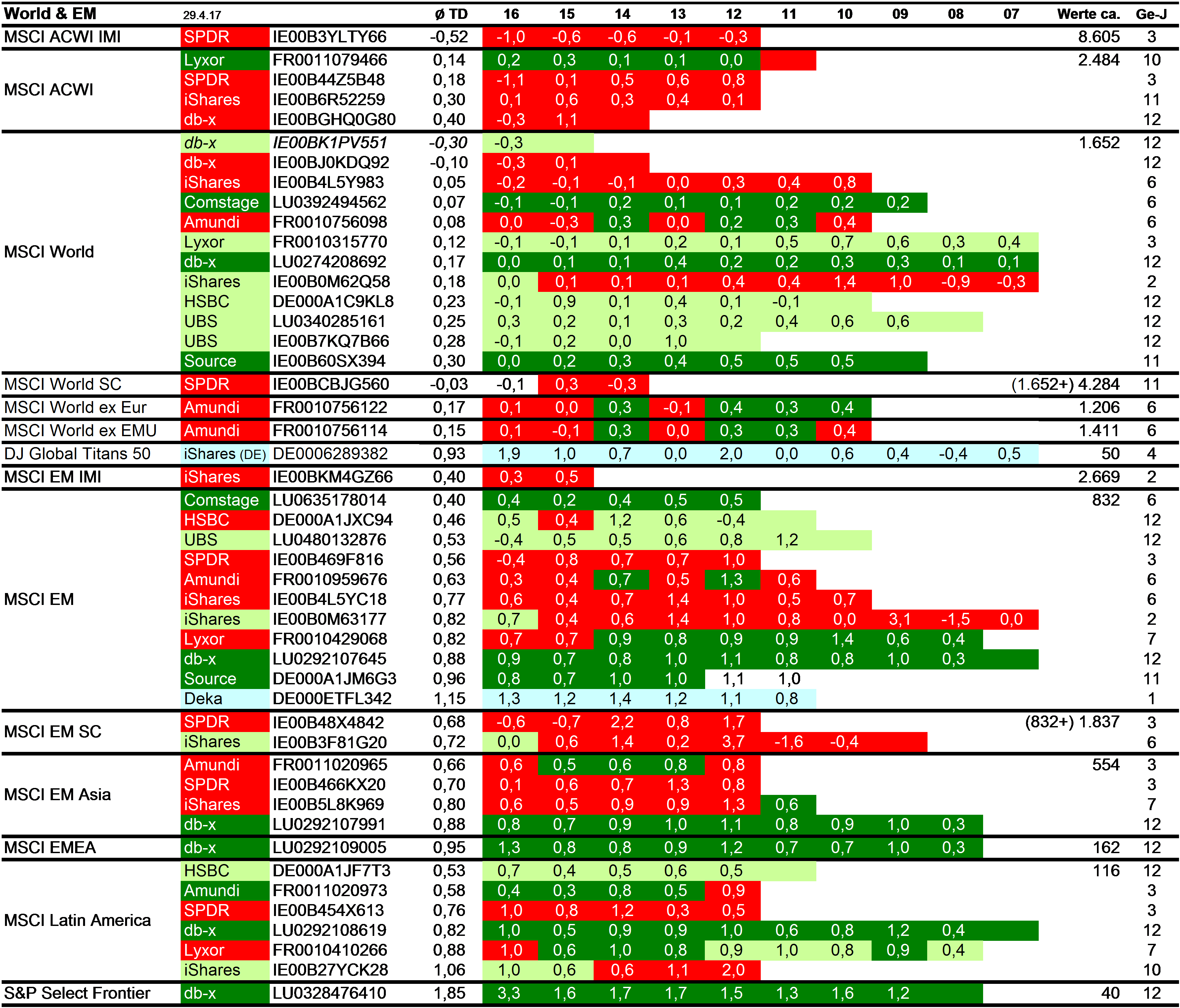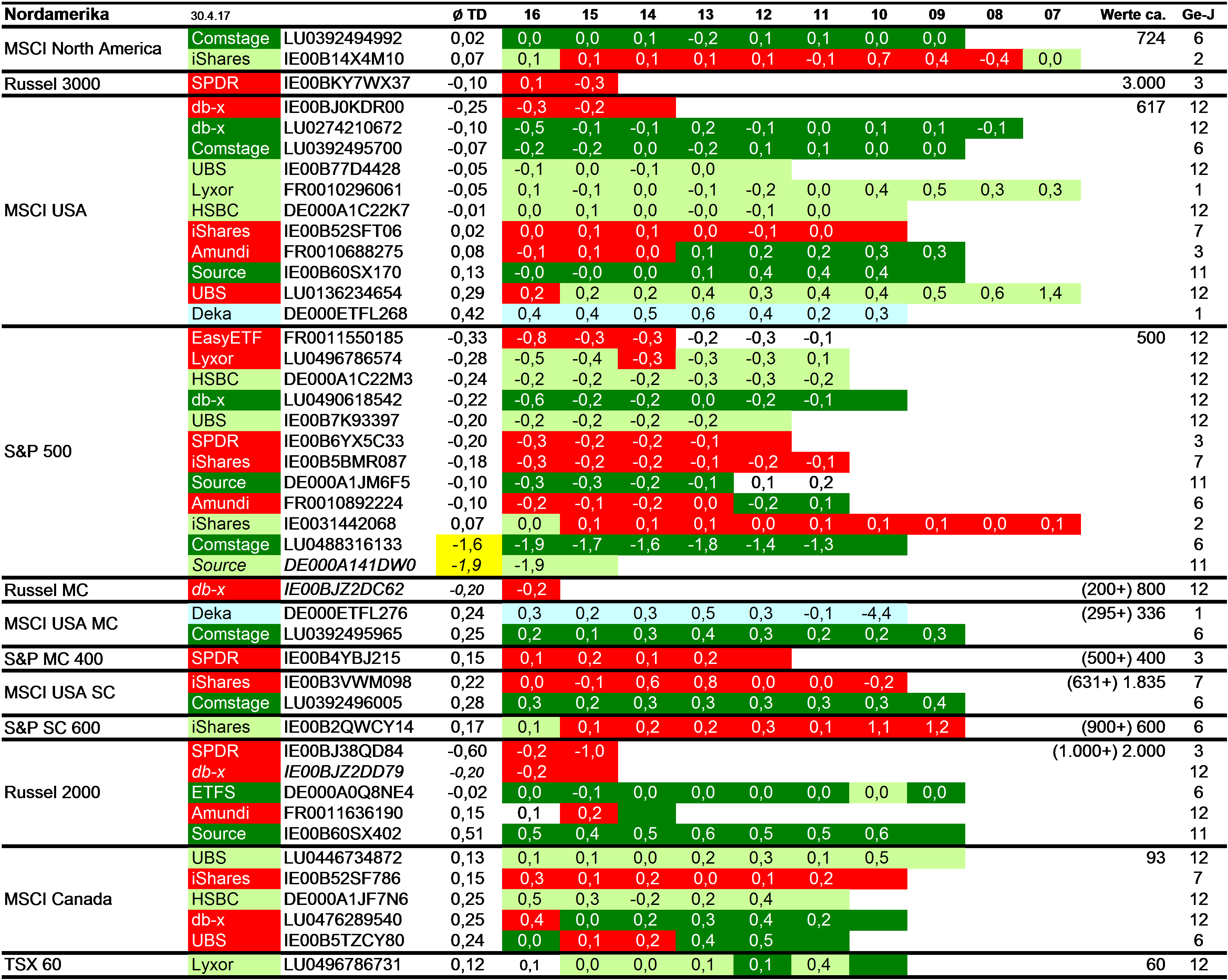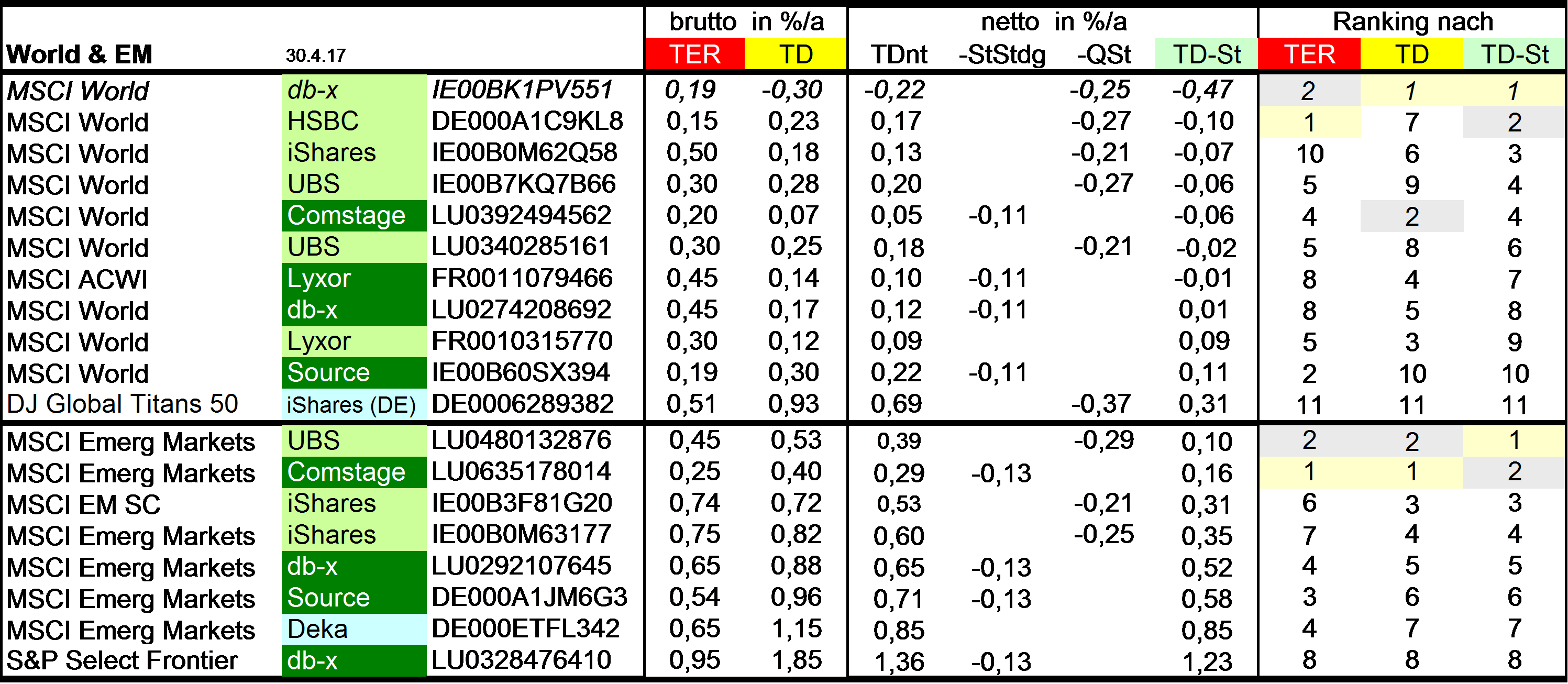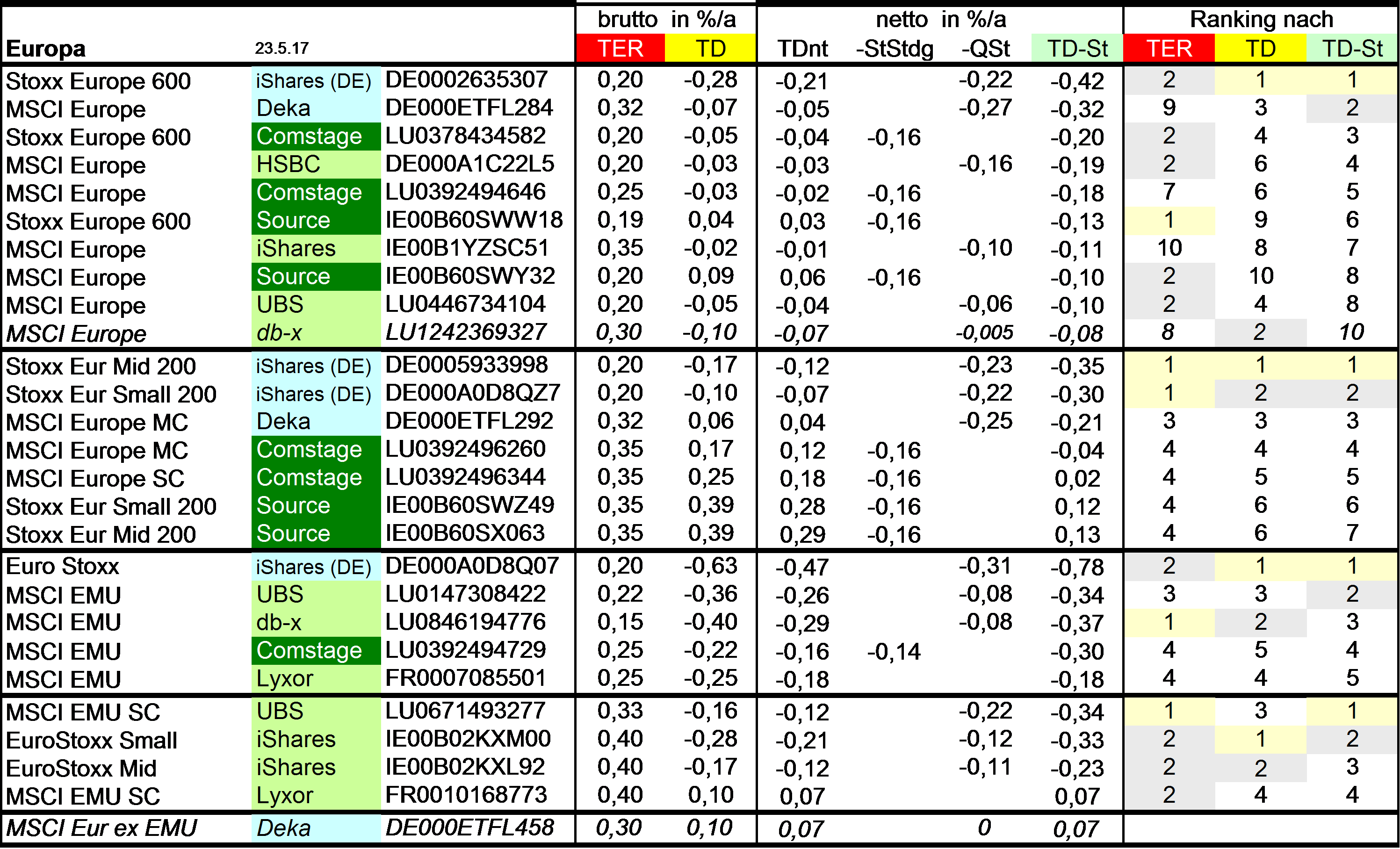 Holzmeier Dezember 15, 2014 · bearbeitet Dezember 15, 2014 von Holzmeier vielen Dank fuer deine Anregungen 2 Verbesserungsvorschläge: (1) Die Liste in Textform überführen, so dass man z. B. die ISINs bequem weiterverwenden kann ohne mühsam vom Screenshot abzutippen. die ISINs in den Tabellen sollten eigentlich nur zur eindeutigen Identifizierbarkeit dienen. Nach eintippen von z.B. "MSCI USA Comstage" waeren die jeweiligen ISINs ja auch anderweitig vergleichsweise aufwandsarm zu ermitteln. Wenn sich an den Informationen etwas ändert kann dann auch jemand anderes die Pflege übernehmen. Der derzeitige Stand hat sonst in einigen Monaten oder gar Jahren nur noch wenig Wert. du hast natuerlich recht, dass solche Listen ohne Pflege zu veralten drohen. Deshalb habe ich vor, die Tabellen ca. halbjaehrlich zu aktualisieren. (2) Die tracking difference von anderer (verlässlicher) Seite als Link einbinden, statt die Daten manuell zu pflegen. Die TD und die Sortierung kann in einigen Monaten oder gar Jahren ganz anders aussehen. Ich wuesste nicht, ob bzw. wo diese Daten auch noch in 5 Jahren ganz sicher wartungsfrei mit der gleichen Programm-Schnittstelle downloadbar waeren. Die mittleren TDen aendern sich ja auch nur einmal jaehrlich, und gluecklicherweise sogar alle zum gleichen Zeitpunkt ... Diesen Beitrag teilen Link zum Beitrag