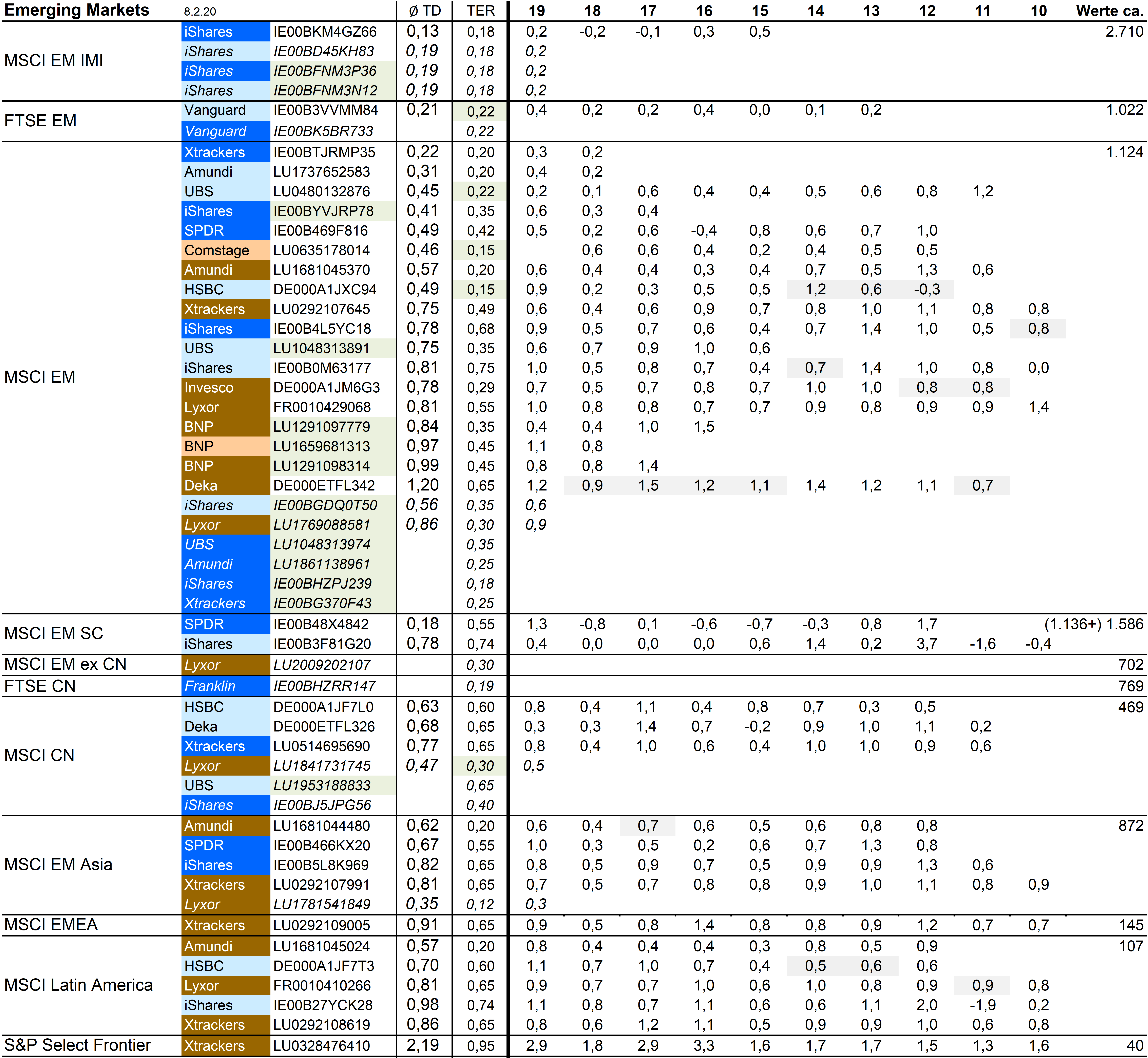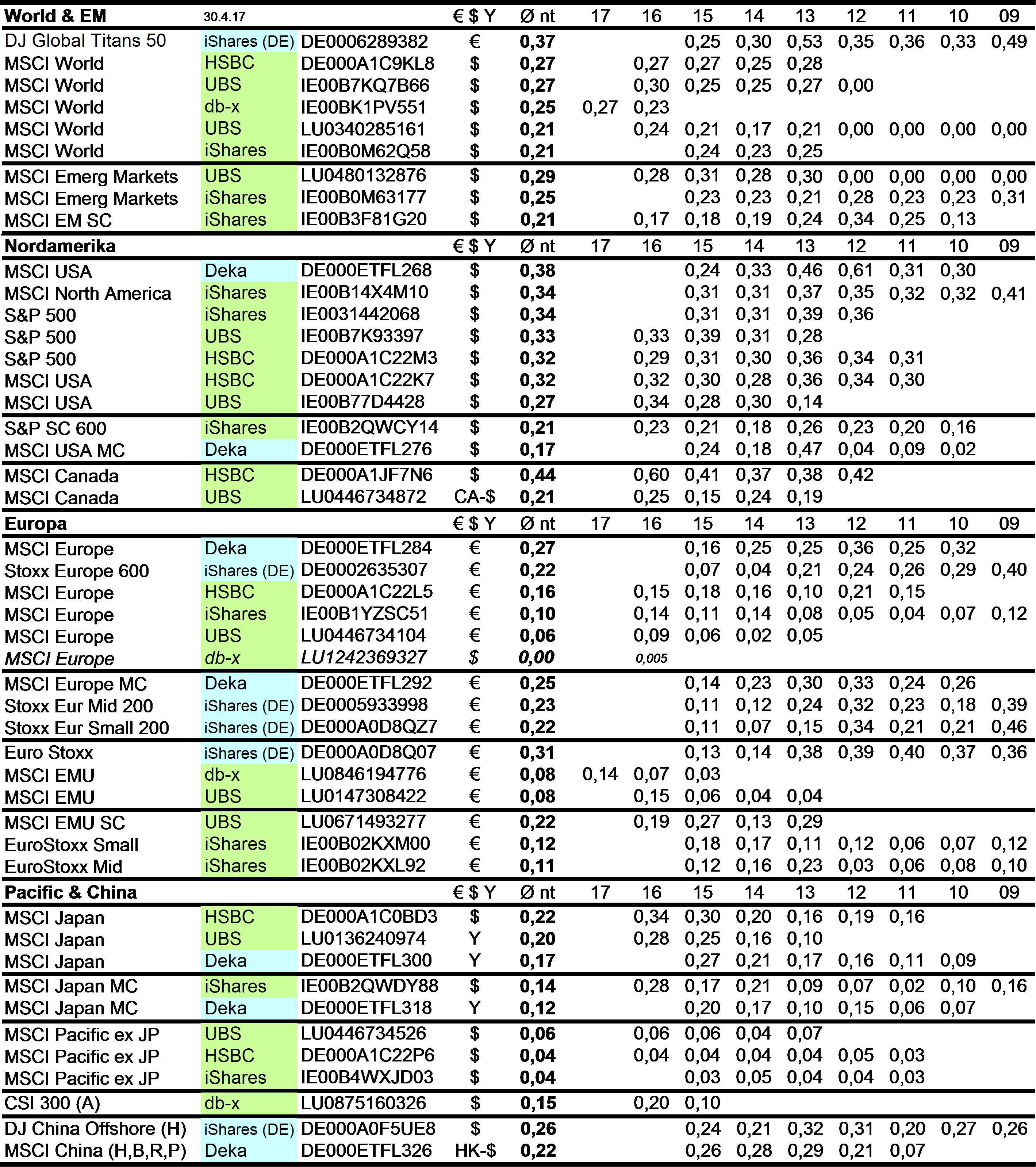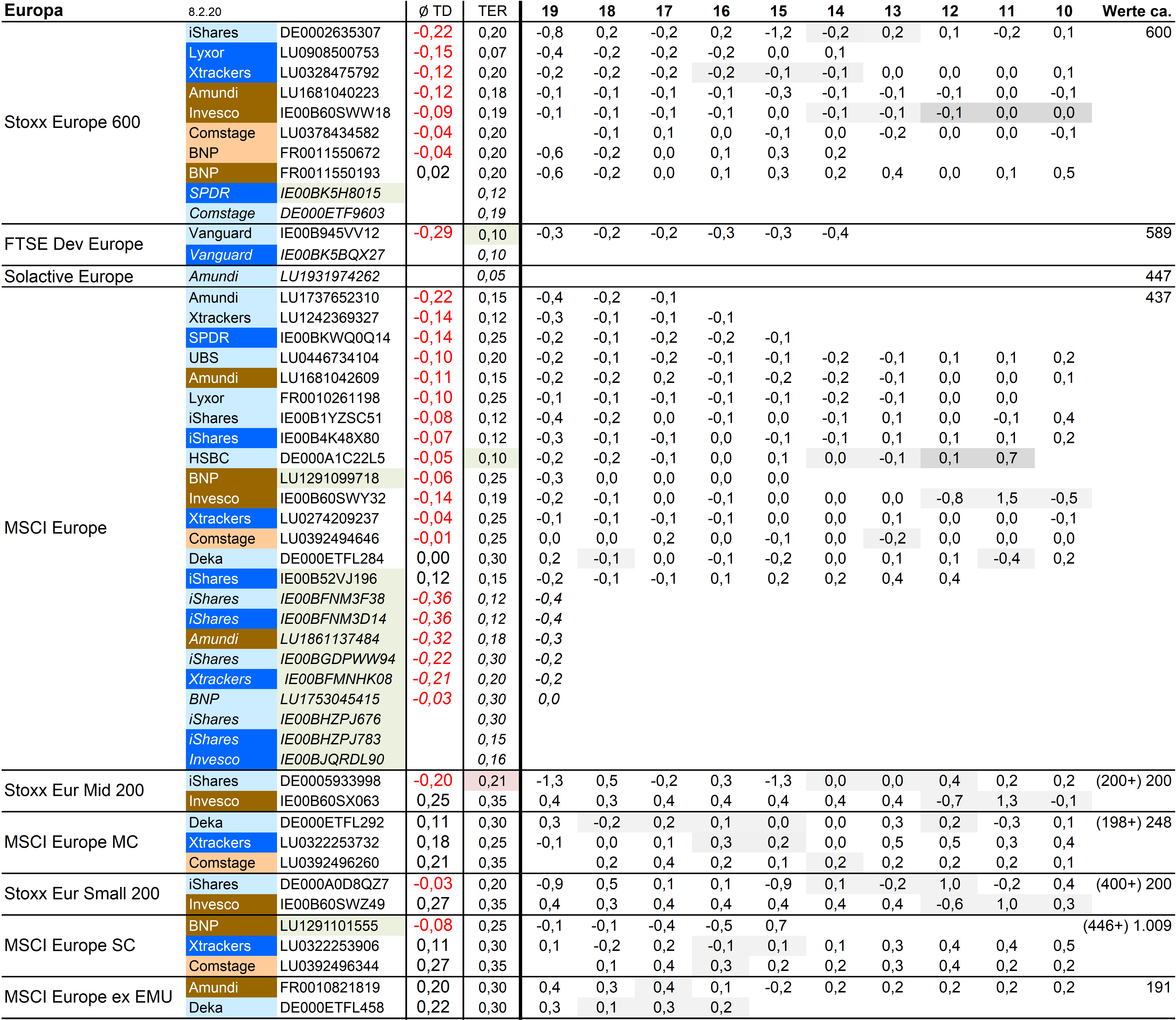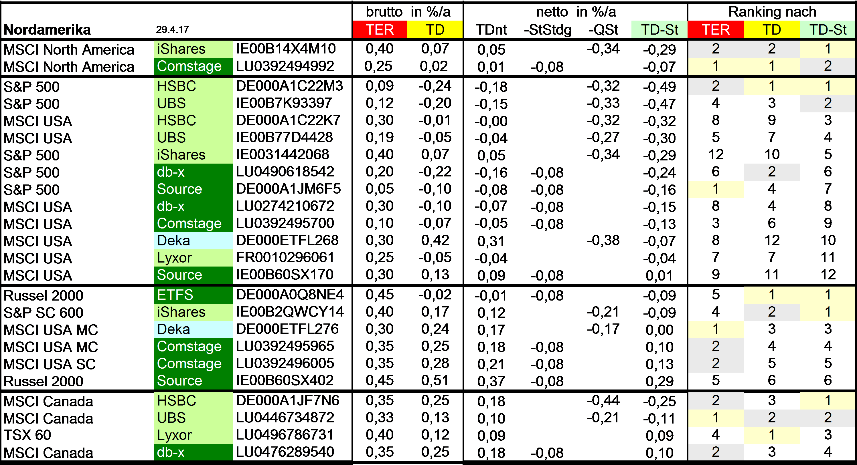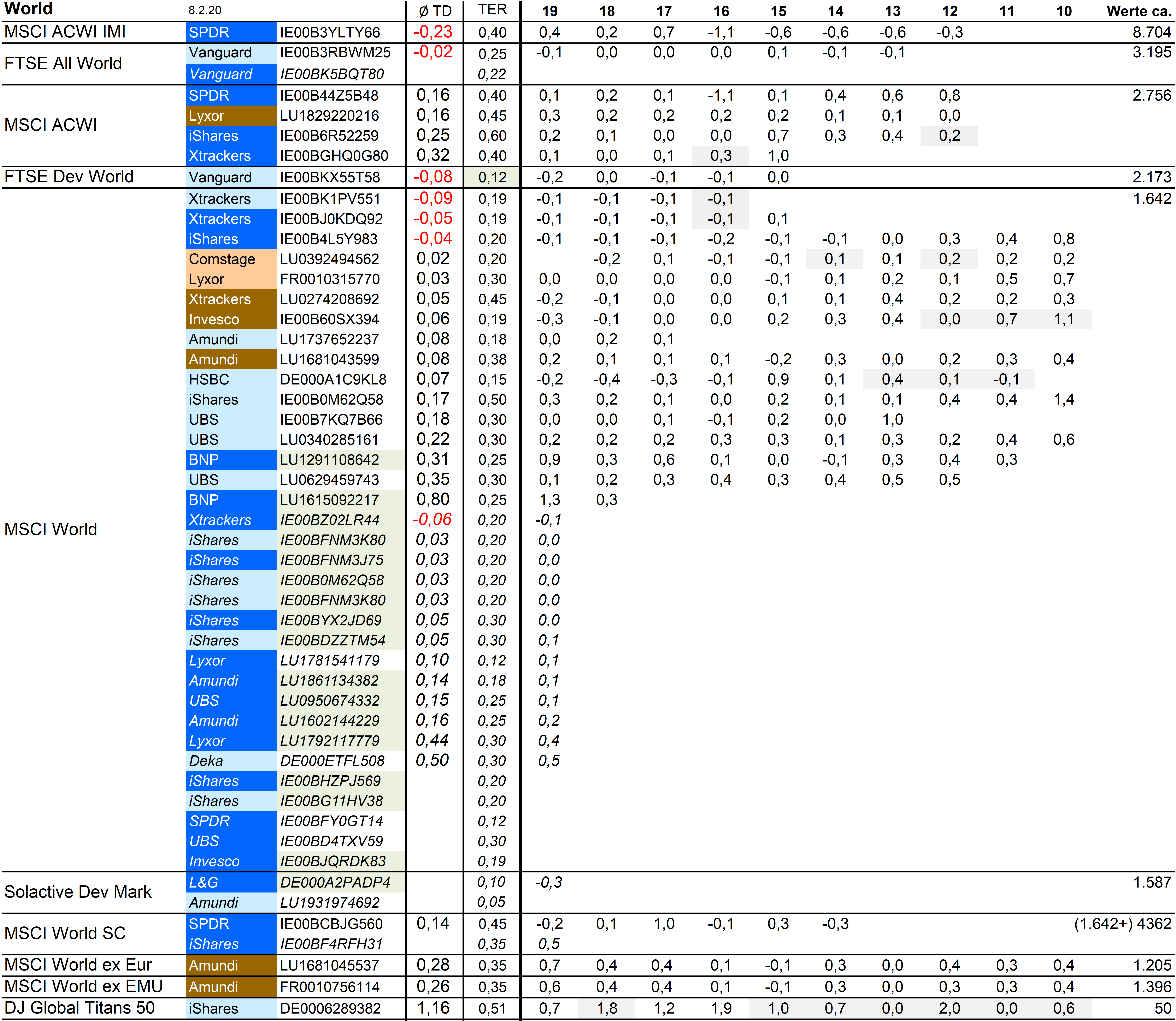 Holzmeier Dezember 15, 2014 · bearbeitet Dezember 15, 2014 von Holzmeier vielen Dank fuer deine Anregungen 2 Verbesserungsvorschläge: (1) Die Liste in Textform überführen, so dass man z. B. die ISINs bequem weiterverwenden kann ohne mühsam vom Screenshot abzutippen. die ISINs in den Tabellen sollten eigentlich nur zur eindeutigen Identifizierbarkeit dienen. Nach eintippen von z.B. "MSCI USA Comstage" waeren die jeweiligen ISINs ja auch anderweitig vergleichsweise aufwandsarm zu ermitteln. Wenn sich an den Informationen etwas ändert kann dann auch jemand anderes die Pflege übernehmen. Der derzeitige Stand hat sonst in einigen Monaten oder gar Jahren nur noch wenig Wert. du hast natuerlich recht, dass solche Listen ohne Pflege zu veralten drohen. Deshalb habe ich vor, die Tabellen ca. halbjaehrlich zu aktualisieren. (2) Die tracking difference von anderer (verlässlicher) Seite als Link einbinden, statt die Daten manuell zu pflegen. Die TD und die Sortierung kann in einigen Monaten oder gar Jahren ganz anders aussehen. Ich wuesste nicht, ob bzw. wo diese Daten auch noch in 5 Jahren ganz sicher wartungsfrei mit der gleichen Programm-Schnittstelle downloadbar waeren. Die mittleren TDen aendern sich ja auch nur einmal jaehrlich, und gluecklicherweise sogar alle zum gleichen Zeitpunkt ... Diesen Beitrag teilen Link zum Beitrag