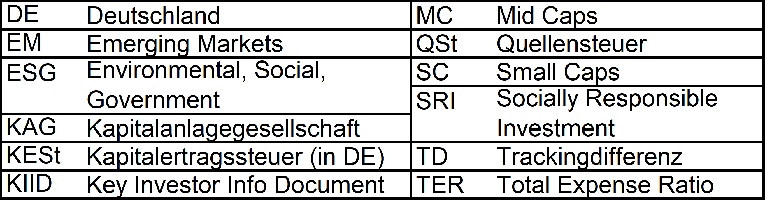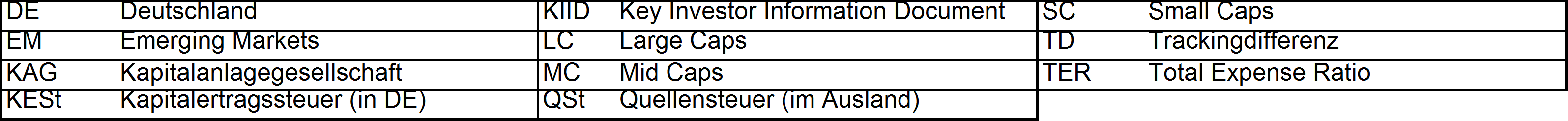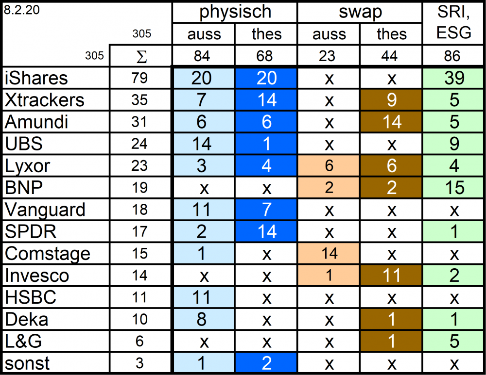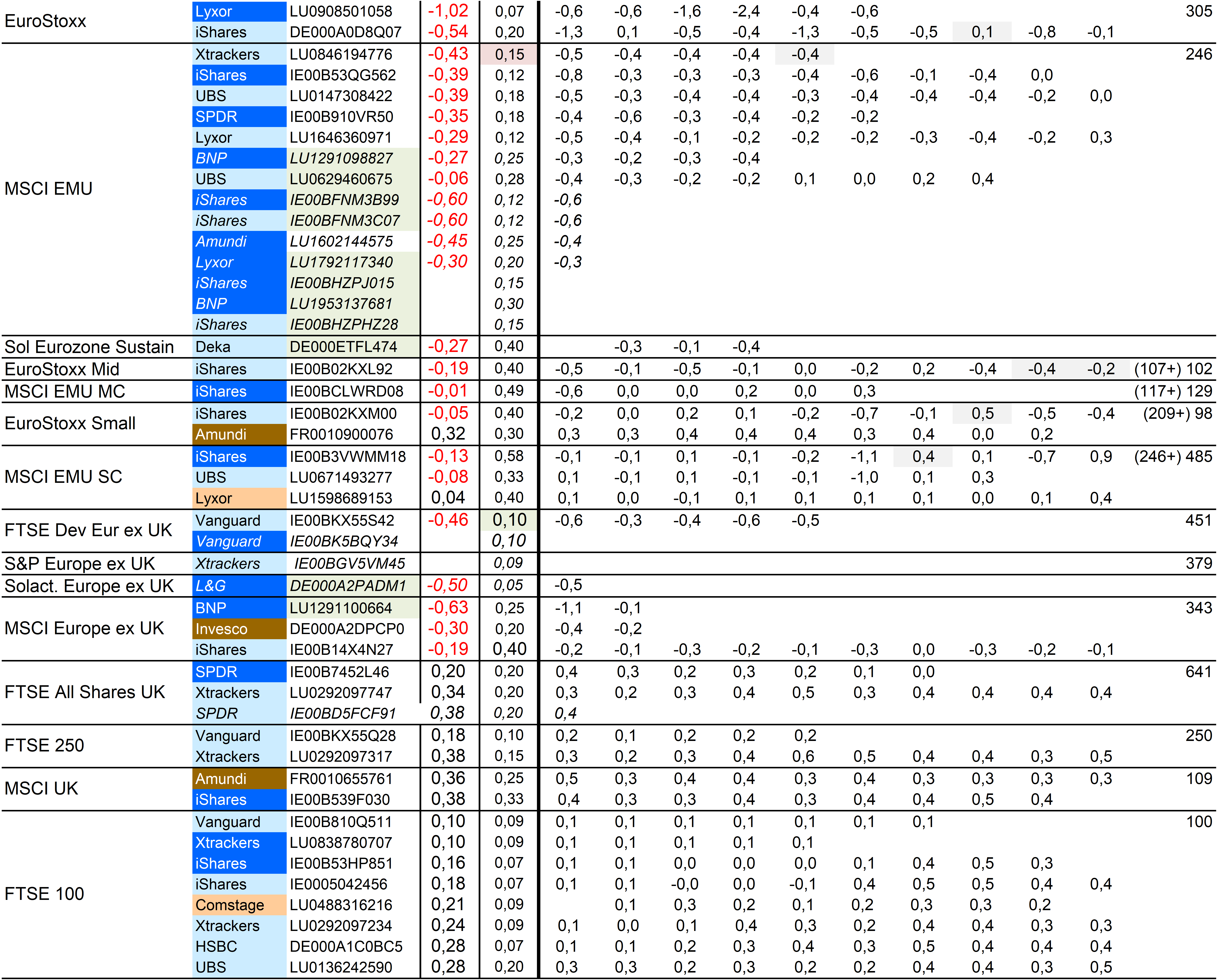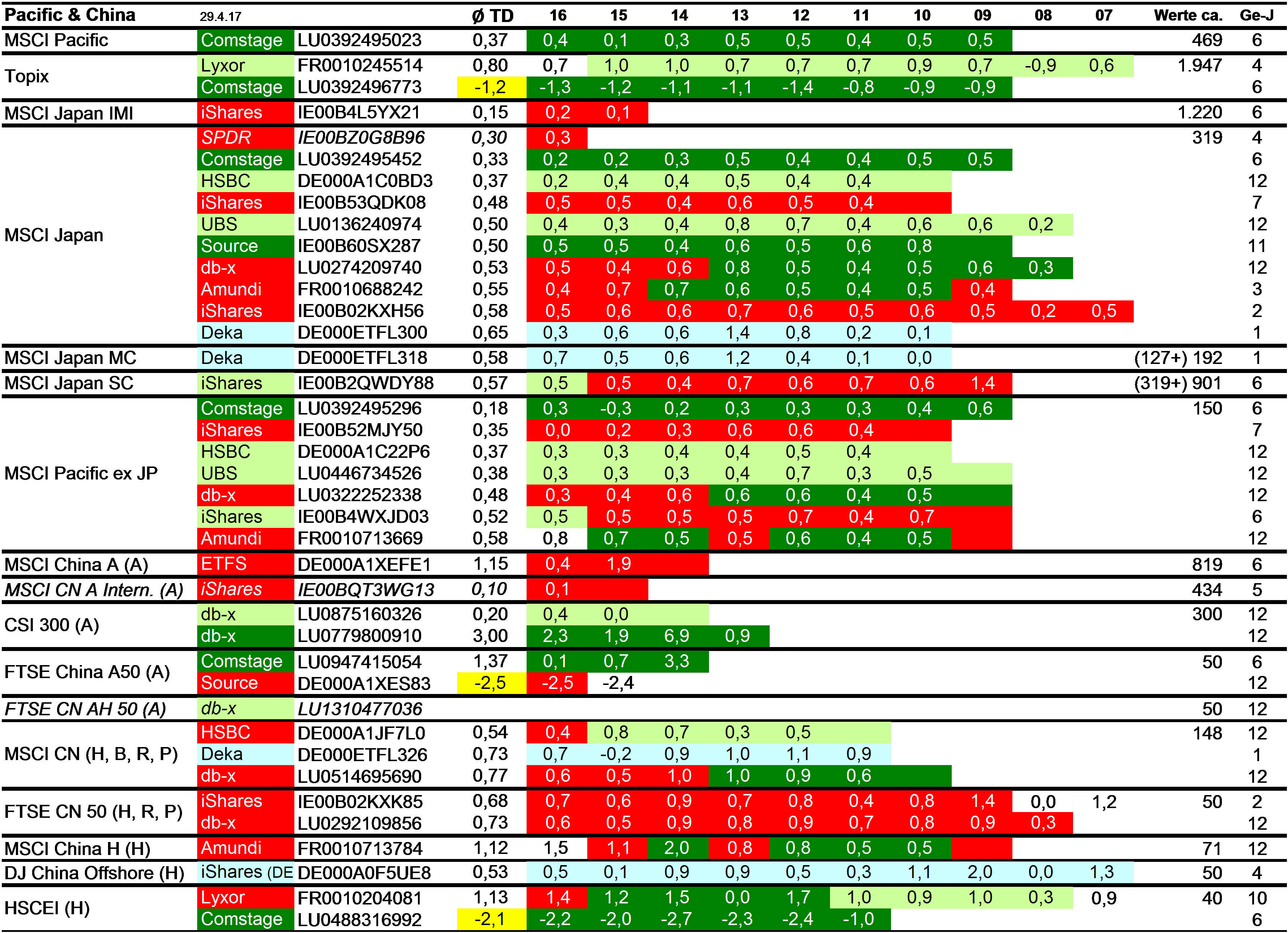 Holzmeier Dezember 15, 2014 · bearbeitet Dezember 15, 2014 von Holzmeier vielen Dank fuer deine Anregungen 2 Verbesserungsvorschläge: (1) Die Liste in Textform überführen, so dass man z. B. die ISINs bequem weiterverwenden kann ohne mühsam vom Screenshot abzutippen. die ISINs in den Tabellen sollten eigentlich nur zur eindeutigen Identifizierbarkeit dienen. Nach eintippen von z.B. "MSCI USA Comstage" waeren die jeweiligen ISINs ja auch anderweitig vergleichsweise aufwandsarm zu ermitteln. Wenn sich an den Informationen etwas ändert kann dann auch jemand anderes die Pflege übernehmen. Der derzeitige Stand hat sonst in einigen Monaten oder gar Jahren nur noch wenig Wert. du hast natuerlich recht, dass solche Listen ohne Pflege zu veralten drohen. Deshalb habe ich vor, die Tabellen ca. halbjaehrlich zu aktualisieren. (2) Die tracking difference von anderer (verlässlicher) Seite als Link einbinden, statt die Daten manuell zu pflegen. Die TD und die Sortierung kann in einigen Monaten oder gar Jahren ganz anders aussehen. Ich wuesste nicht, ob bzw. wo diese Daten auch noch in 5 Jahren ganz sicher wartungsfrei mit der gleichen Programm-Schnittstelle downloadbar waeren. Die mittleren TDen aendern sich ja auch nur einmal jaehrlich, und gluecklicherweise sogar alle zum gleichen Zeitpunkt ... Diesen Beitrag teilen Link zum Beitrag