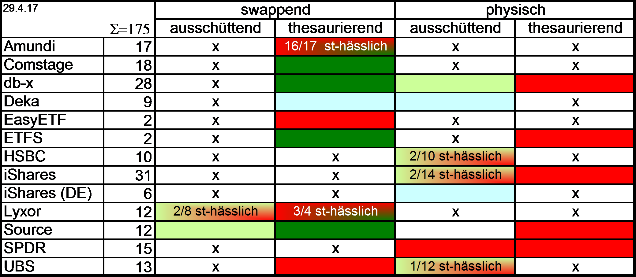 Holzmeier Dezember 14, 2014 · bearbeitet Dezember 30, 2014 von Holzmeier Ich kann mich nur anschließen - eine sehr gute Übersicht mit vielen Informationen. Gerade die TD wird oft viel zu wenig beachtet und die TER führt ja bisweilen in die Irre. vielen Dank! steuereinfach ausschüttend := KESt-Abzüge werden durch eine deutsche KAG oder Depotbank jährlich automatisch vorgenommen. Besonders interessant, wenn der KESt-Freibetrag noch nicht ausgeschöpft ist.Wenn ich es richtig sehe, hast Du hier auch die Fonds mit eingegliedert, deren Ausschüttungen hoch genug sind, die Steuern für die ausschüttungsgleichen Erträge der Teilthesaurierungen abzuführen (Bsp. wären ausschüttende UBS oder HSBC). Da würde ich mir noch eine entsprechende Ergänzung wünschen, auch um Rückfragen zu vermeiden: "Fonds xyz ist doch (teil)thesaurierend, wieso und überhaupt ist der jetzt steuereinfach oder nicht?" Danke fuer den Hinweis, werde ich noch einfuegen. Bei etlichen ETFs besteht das Problem, dass sich die Bedingungen irgendwann ändern. Da stellt beispielsweise der dbx bei etlichen Fonds auf Replizierung um oder ein anderer (comstage und amundi wenn ich recht erinnere) verändert seine Gebühren und schon hat das Auswirkungen auf die mühsam erarbeiteten Werte oder genauer auf die zukünftig zu erwartenden Werte. Ich weiß zwar nicht, wie man solche Informationen in Deine Tabellen integrieren kann, aber vielleicht reicht ja auch schon die eine oder andere Fußnote, wo man Änderungen mit einem Datum vermerkt. die in der Tabelle angegebenen Werte und Einordnungen beziehen sich alle auf die Vergangenheit und sind somit, wenn sie einmal richtig sind, auch dauerhaft zutreffend. Was das ueber zukuenftige Entwicklungen aussagt, ist natuerlich eine andere Frage. Man erkennt aber, dass die meisten KAGen ja offenbar schon auf Kontinuitaet setzen. Insofern ist die beste Annahme wohl erstmal die einer Fortschreibung. Aenderungen bei Steuerstatus und Kosten sind in den Tabellen ja teilweise zu erkennen. Mir war es ehrlich gesagt zu viel Muehe, jeweils noch nach den Gruenden zu recherchieren und diese vor allem belastbar zu verschriftlichen. Viele Infos dazu koennte man wohl im dir ja auch bekannten Thread "ETF-Nachrichten" finden. Wenn mir jemand passende "Fussnoten" schickt, fuege ich die aber gerne ein. Ich habe eben z.B. mal den UBS ETFs plc - MSCI USA SF UCITS ETF (USD) A-acc IE00B3SC9K16 nachgeschaut, weil der 2014 zu steuerhässlich mutiert. Das ist ein Fonds auf Swapbasis und dennoch produziert er seit 2014 ausschüttungsgleiche Erträge. Da würde mich beispielsweise mal interessieren, was sich geändert hat. Haben die ein anderes Trägerportfolio oder was ist da los? mich hat's auch gewundert. Aber Amundi kriegt ja offenbar auch haeufiger als (zumindest von mir) gedacht das Kunststueck hin, einen Swapper steuerhaesslich zu machen ... Diesen Beitrag teilen Link zum Beitrag