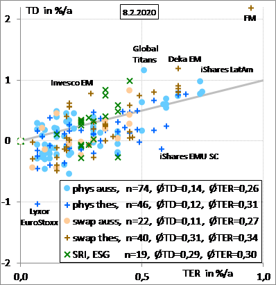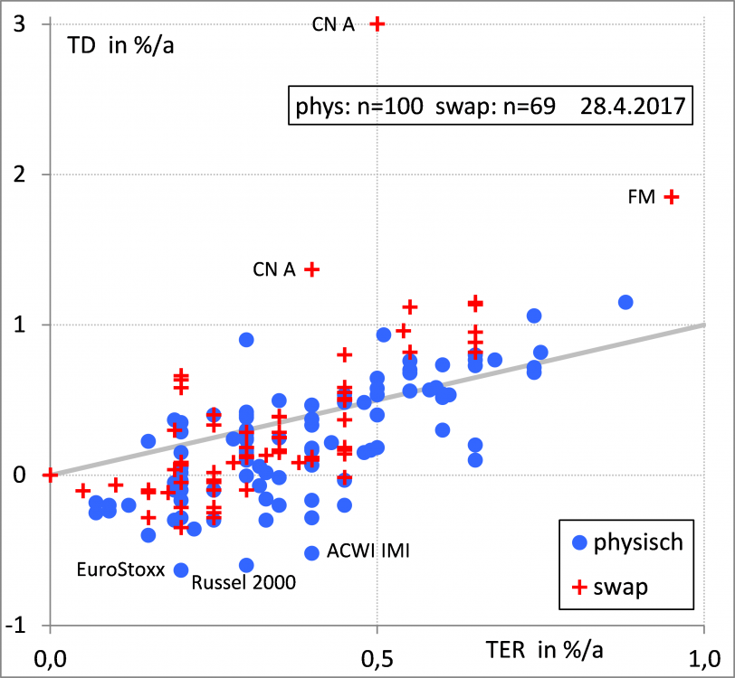 Holzmeier Dezember 14, 2014 Ich finde die TER interessanter als die TD. die TER beinhaltet i.W. die Gebuehren der KAG. Nicht enthalten sind z.B. Kosten fuer Swap-Contrakte, Ertraege aus Wertpapierleihe etc.. Die TD enthaelt letztendlich alle internen Kosten und Einnahmen eines ETF und gibt direkt die Abweichung der brutto-Rendite im Vergleich zum Referenzindex an. Aus meiner Sicht also genau das, was den Anleger (am meisten) interessiert, oder? Die Abweichungen zwischen TER und TD betragen fuer die in den obigen Tabellen angegebenen ETFs uebrigens zwischen ca. -1 bis +1 %/a. Sie sind in aller Regel groesser als die TER selbst, was deren Aussagekraft meines Erachtens doch ziemlich beschraenkt. Diesen Beitrag teilen Link zum Beitrag