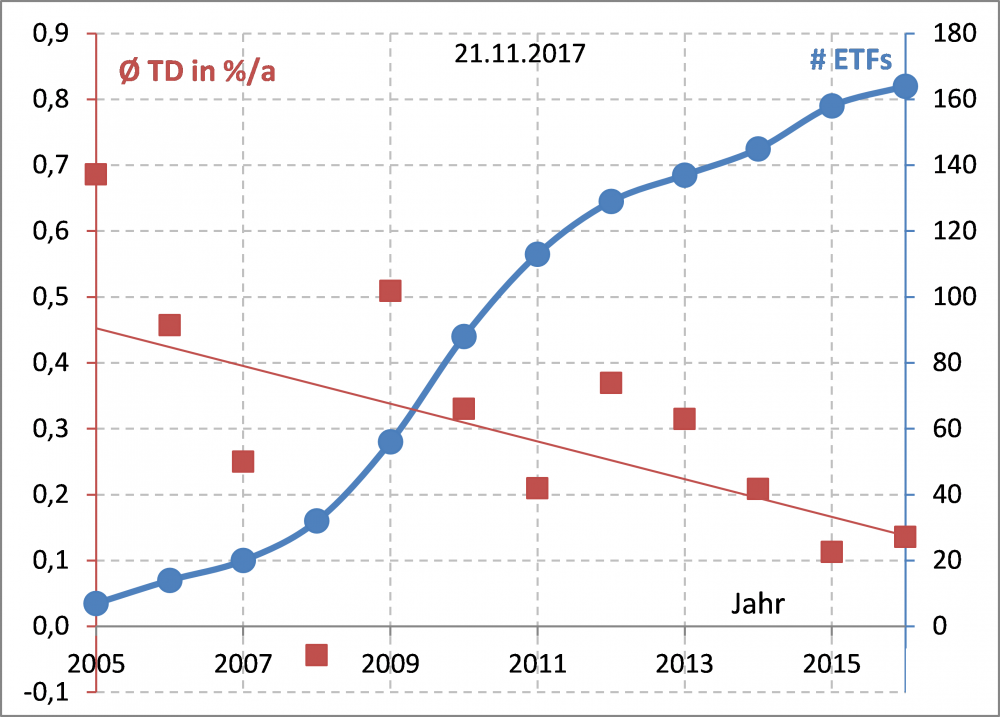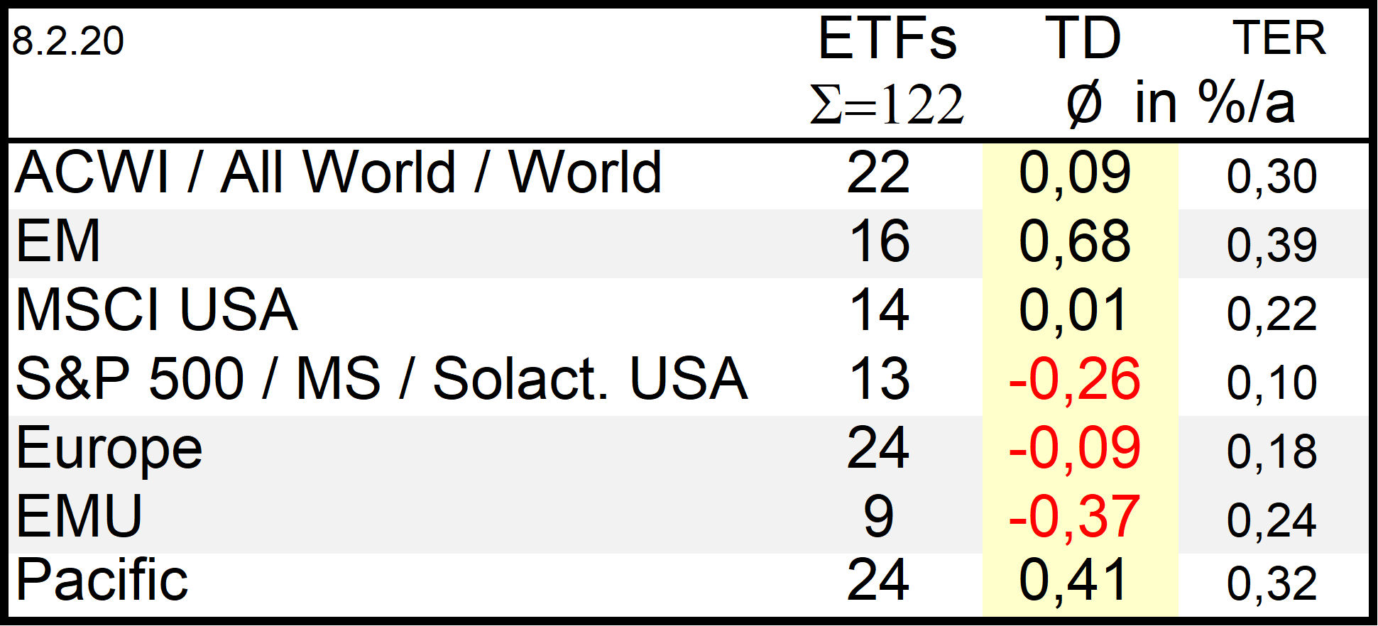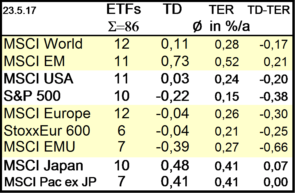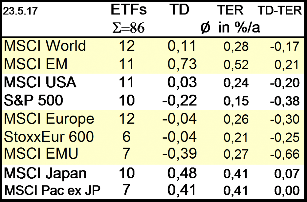 Holzmeier Dezember 15, 2014 TER beschreibt aber Kosten. Kosten sind nunmal normalerweise positiv und wirken sich negativ auf die Performance aus. TD beschreibt aber eine Performancedifferenz zwischen Benchmark und ETF. Deshalb dachte ich bisher immer es gilt TD positiv: ETF performt besser als Benchmak, TD negativ: ETF performt schlechter als Benchmark. Eine kurze Google Suche nach "tracking difference definition", zeigt es es wohl auch andere gibt, die das so wie ich sehen - z.B. hier ETF Securities: es gibt offenbar verschiedene Definitionen fuer das Vorzeichen der Tracking Differenz, vgl. z.B. DAWM: "Die Erwartete Tracking-Differenz ist die auf Grundlage der Wertentwicklung in der Vergangenheit geschätzte Differenz zwischen der Rendite des abgebildeten Index und der Rendite des Fonds." und etwas weiter unten "Erwartete Tracking-Differenz = TER - Erträge aus Wertpapierleihe" (aus der pdf laesst sich nix kopieren, deshalb abgeschrieben inkl. Rechtschreibfehler ...). Die von dir praeferierte Definition wird aber offenbar haeufiger verwendet. Um nicht alle Zahlen noch mal anfassen zu muessen wuerde ich es in den Tabellen jetzt aber erstmal so lassen wollen. Da die zugrunde liegende Definition ja in der Ueberschrift von Tab. 2 angegeben ist sollten Verwechslungen auch ausgeschlosssen sein. Ich hoffe, das ist OK fuer dich (und all die anderen ...). Diesen Beitrag teilen Link zum Beitrag