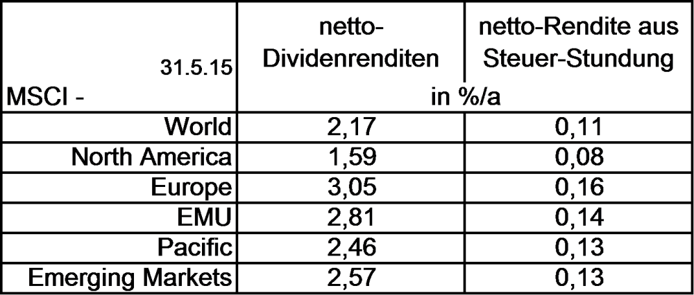 Holzmeier Dezember 13, 2014 · bearbeitet April 27, 2019 von Holzmeier Gültigkeit Dieser ältere Eingangspost: "Steuerstatus und Trackingdifferenzen ..." berücksichtigt die kapitalerstragssteuerlichen Randbedingungen bis einschließlich 2017 Neuer Eingangspost für die Randbedingungen ab 2018 direkt oben drüber (#1) Ziele Rasche Erkennbarkeit, welche Aktien-ETFs auf Standardindizes in DE handelbar sind, sowie welchen (deutschen) Steuerstatus und welche Abweichungen von der jeweiligen Indexperfomance sie in den letzten zehn Jahren aufwiesen Vergleichende Abschätzung der Gesamtkosten von ETFs nach Steuern unter Berücksichtigung der Tracking-Differenzen sowie Steuerstundungen und Anrechnungen ausländischer Quellensteuern (Nebenziel: Straffung mancher WPF-Diskussion vom Typ „Mein erstes Depot“) Gliederung ..1 Begriffsdefinitionen ..2 Steuerstatus und Trackingdifferenzen ......2.1 Steuerstatus ......2.2 Trackingdifferenzen ......2.3 Vergleich der ETFs ..3 Gesamtkosten von ETFs nach Steuern .....3.1 Steuerstundungen .....3.2 Ausländische Quellensteuern .....3.3 Zusammenführung der Erkenntnisse .....3.4 Vergleich der ETFs (Ganz eilige Leser könnten sich auf die Zusammenfassungen und auf Kapitel 3.4 beschränken, ein freundlicher Nutzer hat sogar eine "Gebrauchsanweisung" für den Post auf youtube eingestellt.) 1 ...Begriffsdefinitionen Beim Steuerstatus von ETFs wird im Folgenden unterschieden zwischen steuereinfach (mit mehreren Untergruppen) und steuerhässlich. Alle im Folgenden betrachteten ETFs sind in Deutschland (DE) steuertransparent. steuertransparent := Die Fondsgesellschaft veröffentlicht zumindest jährlich die Besteuerungsgrundlagen im Bundesanzeiger. Wenn ein Fonds nicht steuertransparent ist, findet eine sehr hohe Pauschalbesteuerung statt, alternativ muss der steuerpflichtige Besitzer von Anteilen den Gewinn bzw. Verlust dem Finanzamt "in geeigneter Weise" selbst ermitteln und hinreichend plausibel darstellen. steuereinfach := Ermittlung und Abführung der Kapitalerstragsteuer (KESt) erfolgt automatisch, wenn der ETF bei einer deutschen Depotbank gehalten wird. Als Privatanleger braucht man sich, womöglich mit Ausnahme von Spezialfällen, steuerlich selbst um nichts zu kümmern und muss die Erträge auch nicht in einer (deutschen) Steuererklärung angeben. dauerhaft steuereinfach := Domizil in DE. Dann nimmt bei thesaurierenden ETFs die Kapitalanlagegesellschaft (KAG) und bei ausschüttenden eine deutsche Depotbank den Abzug der fälligen KESt abschließend vor. Diese ETFs sind entweder von Deka oder iShares (DE) sowie alle physisch replizierend und ausschüttend (Ausnahme: Deka MSCI EM, DE000ETFL342, ist ein thesaurierender Swapper). ausschüttungsgleiche Erträge := in den jährlichen Bekanntmachungen im Bundesanzeiger unter b) oder 2) ausgewiesene Erträge eines ETFs. Diese Erträge müssen in DE jährlich versteuert werden, allerdings werden sie im ETF-Vermögen thesauriert und sind der Depotbank für einen Abzug der KESt somit nicht zugänglich. steuereinfach thesaurierend := Die Thesaurierung erfolgt ohne ausschüttungsgleiche Erträge. Wertzuwächse werden erst beim Verkauf abschließend durch eine deutsche Depotbank versteuert. Alle ETFs in dieser Kategorie sind thesaurierende Swapper mit ausländischem Domizil von Comstage, db-x, ETFS oder Source. steuereinfach ausschüttend := Die Thesaurierung erfolgt ggf. mit ausschüttungsgleichen Erträgen, die aber aus steuerlich zeitgleichen Ausschüttungen neutralisiert werden können. Dann werden die KESt-Abzüge auf die ausschüttungsgleichen und die ausgeschütteten Erträge abschließend durch eine deutsche Depotbank vorgenommen. Dies gilt für diese sog. teilthesaurierenden ETFs, sofern im Bundesanzeiger bei der Thesaurierung zum Geschäftsjahresende die Ausschüttung mindestens 40% der ausschüttungsleichen Erträge umfasst. Die ETFs in dieser Kategorie haben ein ausländisches Domizil und können physisch replizierend (HSBC, UBS, db-x, seit kurzem auch iShares) oder swappend sein (Lyxor, Source). steuerhässlich := Die Thesaurierung erfolgt mit ausschüttungsgleichen Erträgen, die nicht aus steuerlich zeitgleichen Ausschüttungen neutralisiert werden können. Diese ETFs erfordern ein manuelles Ausfüllen der Anlage KAP der Einkommenssteuererklärung und können beim Verkauf zudem zu Doppelbesteuerungen führen. Streng genommen müsste „steuerhässlich“ noch differenziert werden. Einzelne steuerhässliche Jahre mögen für manche akzeptabel sein, da eine Doppelbesteuerung dann monetär kaum ins Gewicht fiele. Im Folgenden wurde ein ETF als steuerhässlich eingestuft, wenn nach dem Eröffnungsjahr innerhalb der letzten 10 Jahre weitere steuerhässliche ausschüttungsgleiche Erträge auftraten. Zu dieser Kategorie gehören u.a. alle thesaurierenden physisch replizierenden ETFs mit ausländischem Domizil manche thesaurierende Swapper (UBS und EasyETF immer, Amundi und Lyxor meistens) sowie die ausschüttenden ETFs von SPDR, die, warum auch immer, zuerst ausschütten und erst später thesaurieren. iShares ist bis vor kurzem ebenso verfahren, hat aber im Herbst 2015 angekündigt dies zukünftig für die allermeisten ausschüttenden ETFs ändern zu wollen und hat sich bei fast allen seitdem erfolgten Jahresabschlüssen auch daran gehalten (Ausnahme bisher: iShares FTSE China 50, IE00B02KXK85). Die Trackingdifferenz (TD) gibt kalenderjährlich die prozentuale Wertentwicklungen eines Performance-Index abzüglich der Wertentwicklung des diesen Index nachbildenden ETFs an. Nach dieser Definition ist bei einer negativen TD die Performance des ETFs also besser als die des jeweiligen Index. TDen können verschiedene Ursachen haben: Neben der Total Expense Ratio (TER) spielen hier Kosten von Umschichtungen oder von Swap-Kontrakten eine Rolle, ebenso ggf. Erträge aus Wertpapierleihe als auch ggf. Quellentsteuer-Erstattungen, vgl. ggf. hier bei justETF. Anders als die TER ist die TD somit eine Größe, die die ETF-int