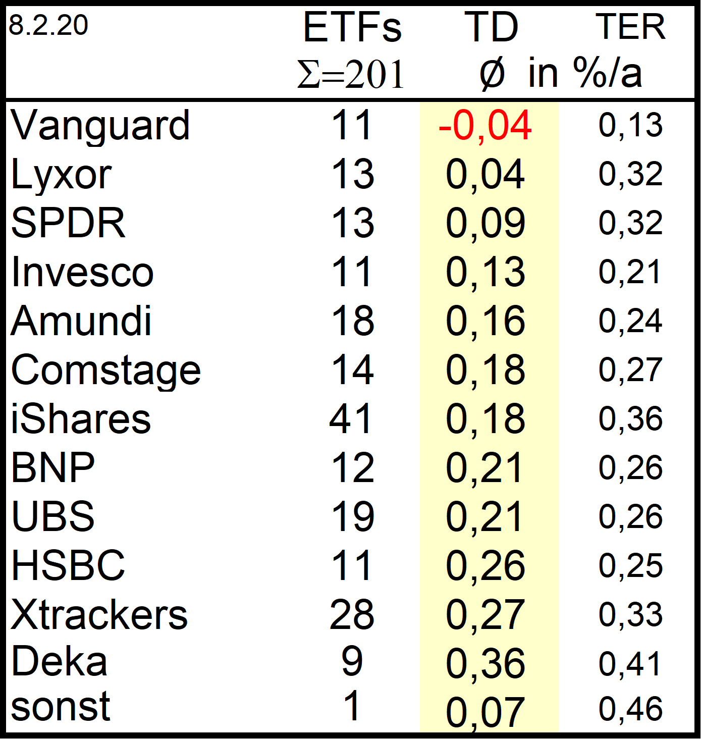 sparfux Dezember 15, 2014 · bearbeitet Dezember 15, 2014 von sparfux TD := Performance Benchmark - Performance ETF schien mir plausibler, da es dann mit dem Vorzeichen der TER korreliert. Ansonsten haette ein ETF, der interne Kosten nur in Hoehe der TER aufwiese z.B. eine TER von +0,2 %/a, aber eine TD von -0,2 %/a. DAWM (vgl. dort unter "Stammdaten") macht es im uebrigen genauso. TER beschreibt aber Kosten. Kosten sind nunmal normalerweise positiv und wirken sich negativ auf die Performance aus. TD beschreibt aber eine Performancedifferenz zwischen Benchmark und ETF. Deshalb dachte ich bisher immer es gilt TD positiv: ETF performt besser als Benchmak, TD negativ: ETF performt schlechter als Benchmark. Eine kurze Google Suche nach "tracking difference definition", zeigt es es wohl auch andere gibt, die das so wie ich sehen - z.B. hier ETF Securities: Tracking difference is usually negative, meaning that the ETP underperforms its benchmark. However, sampling replication and revenue from securities lending can both cause physically backed ETFs to have a positive tracking difference, in which case the ETF has outperformed its benchmark. Diesen Beitrag teilen Link zum Beitrag