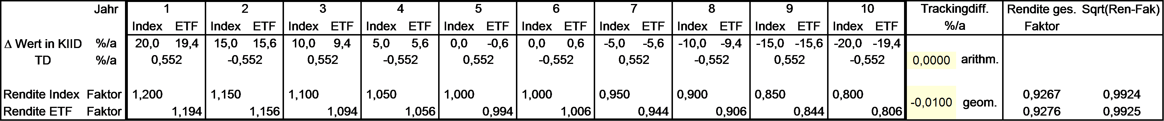 Holzmeier Mai 1, 2019 · bearbeitet Mai 1, 2019 von Holzmeier vor 19 Stunden von sigmabe: Und wenn man es jetzt wirklich genau nehmen will, wird es noch komplizierter. Wenn man die Indexrendite r_i und TD td_i in Jahr i hat, hätte man vermutlich für die annualisierte Trackingdifferenz td_ann nach n Jahren mit der hier üblichen Konvention eher so etwas in die Richtung von 1 7 kB Ich hatte das bevor ich die Tabellen aufgesetzt hatte auch schon mal ueberlegt. Mathematisch betrachtet hast du natuerlich recht. Allerdings ist, wie du ja auch schreibst, der Einfluss der geometrischen Mittelung bei den hier relevanten relativ kleinen Trackingdifferenzen gering. Das folgende Beispiel zeigt bereits den worst case: Mittelung ueber einen langen Zeitraum, hier 10 Jahre, relativ hohe Wertschwankungen und Trackingdifferenzen abwechselnd positiv und negativ. Damit die Differenz zwischen arithmetischer und geometrischer Mittelung die in den Tabellen fuer die Mittelwerte angegebene Genauigkeit von 0,01% beeinflusst, muss der Betrag der TD dann schon in jedem Jahr 0,55%/a betragen (durch Rundungen koennte es ggf. auch schon vorher einen minimalen Einfluss geben). Es kommt also in praktisch allen Faellen ohnehin das Gleiche raus, allerings ist die geometrischen Mittelung fuer die Nutzer intransparenter. Kritische Nutzer sind aber sehr wichtig fuer die Qualitaetskontrolle, siehe das Beispiel, das die Diskussion hier ausgeloest hat. Und wenn wir schon dabei sind: Eigentlich muesste man dann auch noch eine Waehrungskorrektur durchfuehren, da die Fondswaehrung der meisten ETFs nicht Euro ist und auch die TDen dann nicht in Euro angegeben werden ... Das Hauptproblem ist m.E., dass andere Fehler viel groesser sind. So sind die Index- und ETF-Renditen in den KIIDs nur auf eine Nachkommastelle genau angegeben. Angenommen, die Indexrendiite betrage in einem Jahr 0,0 % und die ETF-Rendite -0,2%. Eine daraus wie auch immer ermittelte TD liegt dann also bei 0,2%, aber die reale TD befindet sich mit jeweils gleicher statistischer Wahrscheinlichkeit irgendwo zwischen (0,05-0,15)%=-0,1% und (-0,05-0,25)%=-0.3%. Dieser Fehler liesse sich nur verringern, indem alle Renditen noch mal in den Jahresberichten nachgeschlagen wuerden, dort sind sie in der Regel auf zwei Nachkommastellen genau angegeben. Das ist mir aber ehrlich gesagt zu aufwendig. Die Rundungen bereits in den KIIDs sind m.E. die Quelle der groessten Unsicherheiten bei den TD-Ermittlungen. Zum Glueck wird dieser Fehler umso kleiner je mehr Werte betrachtet werden, verunmoeglicht m.E. aber die systematische Verwendung der Einzelwerte fuer genauere Untersuchungen. Die von mir grob zu 0,1%/a abgeschaetzte Genauigkeit der ermittelten Trackingdifferenzen ist daher nur begrenzt durch statistische Akrobatik verkleinerbar, das Hauptproblem liegt m.E. in den Unsicherheiten der Datengrundlagen. Die Rundungsfehler in den KIIDs sind auch einer der Gruende, warum ich bisher keine Varianzen der jaehrlichen TDen ermittelt und angegeben habe. Die Aussagekraft ist aus meiner Sicht begrenzt, fuer den Langfristanleger sind sie eigentlich ohnehin irrelevant. Auch taeuschen Varianzen ggf. eine nicht vorhandene Genauigkeit vor, z.B. ergeben zwei gleiche TDen auch die Varianz 0. Varianzen moegen hilfreich sein, um ETFs mit starkem optimiertem Sampling zu erkennen, aber auch aus Anlegersicht positive Kostensenkungen fuehren zu hoeheren Varianzen. Daher in Kap. 3, Unsicherheiten: "Die über die letzten sieben Jahre gemittelten TDen sollten daher nicht ohne kritische Betrachtung der einzelnen Jahreswerte als Auswahlkriterium gewählt werden, geben aber oft gute Hinweise auf die voraussichtlich zu erwartenden ETF-internen Kosten." Diesen Beitrag teilen Link zum Beitrag