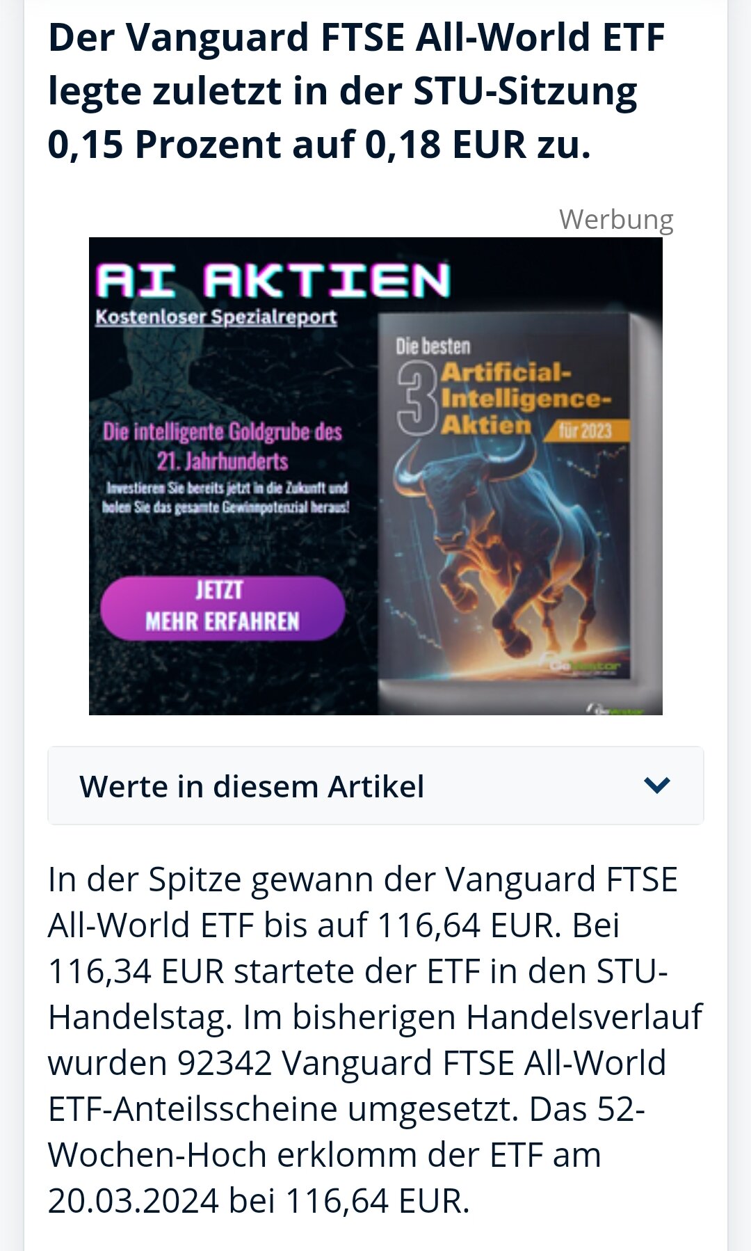 th23 März 28, 2024 vor einer Stunde von TheBride: Pssssst: In der Zwischenzeit generiert die Ausschüttung ... schon weitere 0,07% Gratisgeld auf dem Verrechnungskonto Also wenn man dabei sooo genau vergeleichen will, dann wäre nach meiner Meinung ein Blick auf die Wertstellung sinnvoll - zB bei der ING erfolgt die Buchung bisher immer 1-2 (Bankarbeits-)Tage verzögert, dann aber mit Wertstellung / Valuta zum "Zahltag" wie von Vanguard angegeben Diesen Beitrag teilen Link zum Beitrag