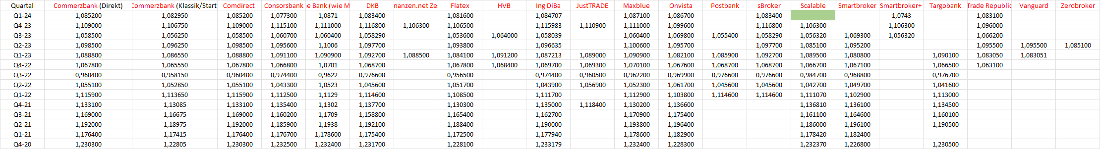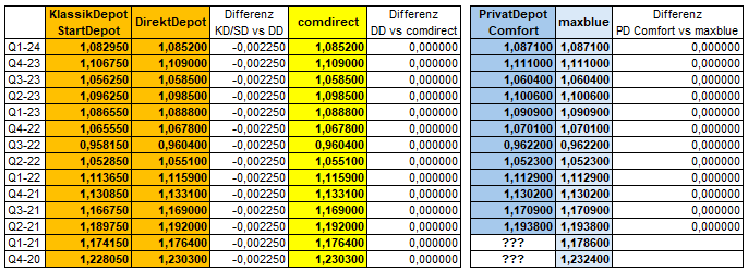 MonacoFranzl April 4, 2024 · bearbeitet April 4, 2024 von MonacoFranzl So eine Aufstellung hat doch schon mal jemand über einen langen Zeitraum gemacht, vielleicht kann man da noch ein paar Daten herholen. Ich war der Meinung, dass ich jedes Quartal hier Werte zugeliefert habe ... aber ist auch recht unübersichtlich. Habe nochmal die Werte seit 2022 rausgesucht ... wenn die alten Werte benötigt werden, muss ich nochmal kramen. Erste Spalte Commerzbank KlassikDepot & Startdepot (sind identisch), zweite Spalte Deutsche Bank Q1-24 1,082950 1,087100 Q4-23 1,106750 1,111000 Q3-23 1,056250 1,060400 Q2-23 1,096250 1,100600 Q1-23 1,086550 1,090900 Q4-22 1,065550 1,070100 Q3-22 0,958150 0,962200 Q2-22 1,052850 1,052300 Q1-22 1,113650 1,112900 Q4-21 1,130850 1,130200 Q3-21 1,166750 1,170900 Q2-21 1,189750 1,193800 Q1-21 1,174150 ??? Q4-20 1,228050 ??? Diesen Beitrag teilen Link zum Beitrag