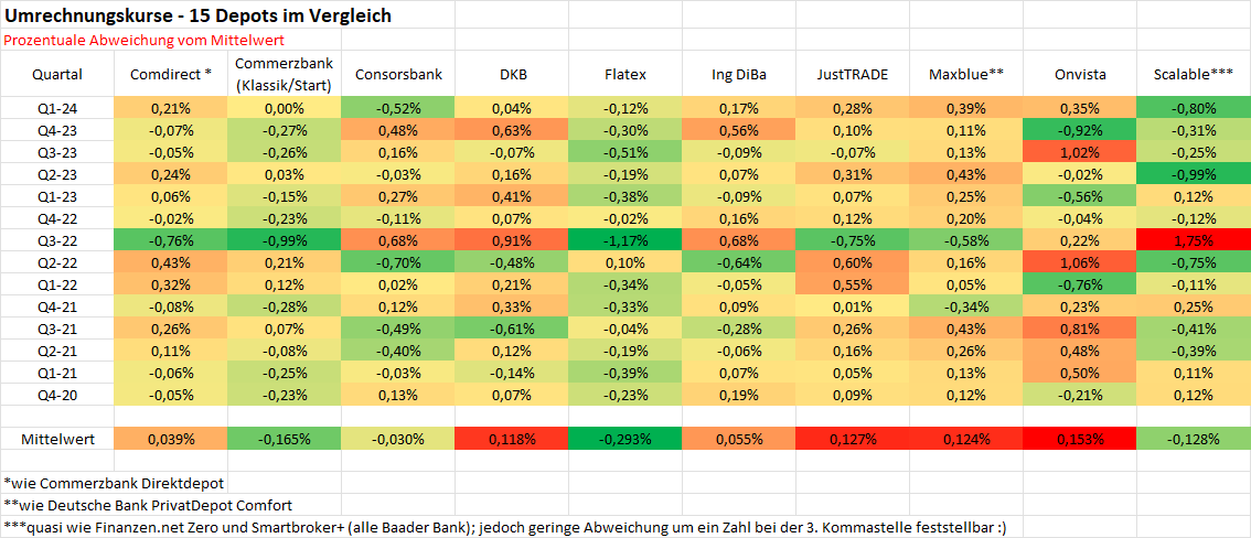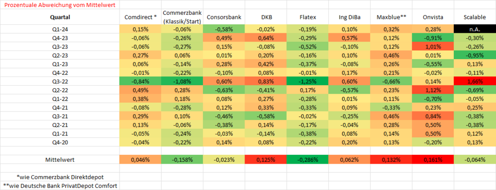 MonacoFranzl April 4, 2024 Ich habe die Zahlen für das Commerzbank KlassikDepot und StartDepot sowie für das Deutsche Bank PrivatDepot Comfort im obigen Post ergänzt. Da kafka die Zahlen für das Commerzbank DirektDepot nochmals komplett gepostet hat und die Zahlen für comdirect und maxblue oben zu finden sind, habe ich nochmal all diese Werte in Excel gegenübergestellt... Das Commerzbank DirektDepot scheint immer einen um 0,00225 schlechteren Kurs zu haben als das Commerzbank KlassikDepot bzw. das Commerzbank StartDepot, scheint aber immer identisch mit der comdirect. Das Deutsche Bank PrivatDepot Comfort scheint immer identisch mit maxblue. Commerzbank und Deutsche Bank haben noch weitere Depotmodelle im Angebot, da liegen aber keine Zahlen vor. Diesen Beitrag teilen Link zum Beitrag