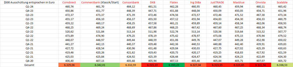 Richie_Rich April 19, 2024 · bearbeitet April 19, 2024 von Richie_Rich On 4/17/2024 at 12:06 PM, schweinebank said: Jetzt zur doofen Fragen: Versteh ich es richtig, das ein negativer Mittelwert quasi einen höheren "Gewinn" für den Anleger bedeutet - ein positiver einen "Verlust"? Ich hab ein ING Depot - war aber am überlegen zum Trennen ein weiteres zu eröffnen - Flatex ist da in der Auswahl. Sehe das auch so wie @Operat9r So, wie ich das interpretiere und berechne (jeder sollte bei Interesse nachprüfen, ob die Formeln überhaupt richtig sind usw.), wundert man sich im Einzelfall schon mal, warum man einen guten oder schlechten Wechselkurs bei seinem Broker erwischt hat, aber die Datensammlung zeigt, dass es sich über die Zeit mittelt und keine Relevanz für die Auswahl des Brokers haben sollte. Um das zu verdeutlichen, ein vereinfachtes Rechenbeispiel für ein ca. 100k Depot und welche Unterschiede während der letzten dreieinhalb Jahre rausgekommen sind. Diesen Beitrag teilen Link zum Beitrag