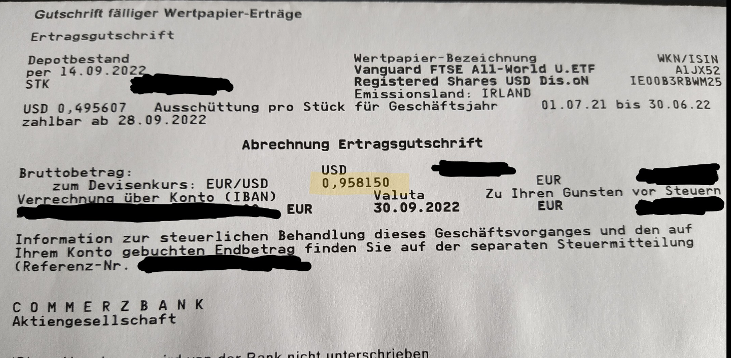 DennyK Oktober 1, 2022 · bearbeitet Oktober 1, 2022 von DennyK Scalable hängt ja mal wieder mit mit dem Abgleich des Baader Bank Verrechnungskonto, dort ist meine Vanguard Ausschüttung (für einen anderen ETF) vom 28.9. bereits gestern gutgeschrieben worden. Wenn ich mich nicht verrechnet habe müsste der Wechselkurs bei 0,985755 EUR/USD gewesen sein. Abrechnung ist bei der Baader Bank noch nicht verfügbar. Diesen Beitrag teilen Link zum Beitrag