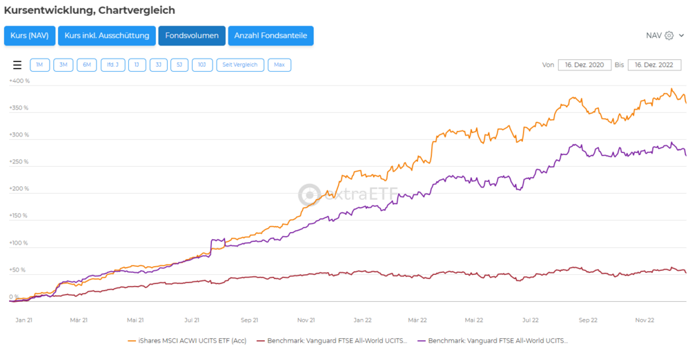 Mangalica Dezember 18, 2022 Wachstum der Fondsvolumen in den letzten zwei Jahren. Prozentual wird der gute alte A1JX52 (rot) sowohl von seinem thesaurierendem Bruder (lila) als auch vom iShares AWCI (orange) komplett abgehängt. Absolut gesehen hat er mit 8 Mrd aber noch die Nase vorn, die beiden anderen kommen mit mittlerweile über 5 Mrd aber immer näher. Diesen Beitrag teilen Link zum Beitrag
