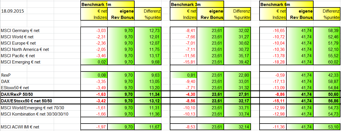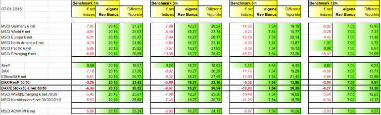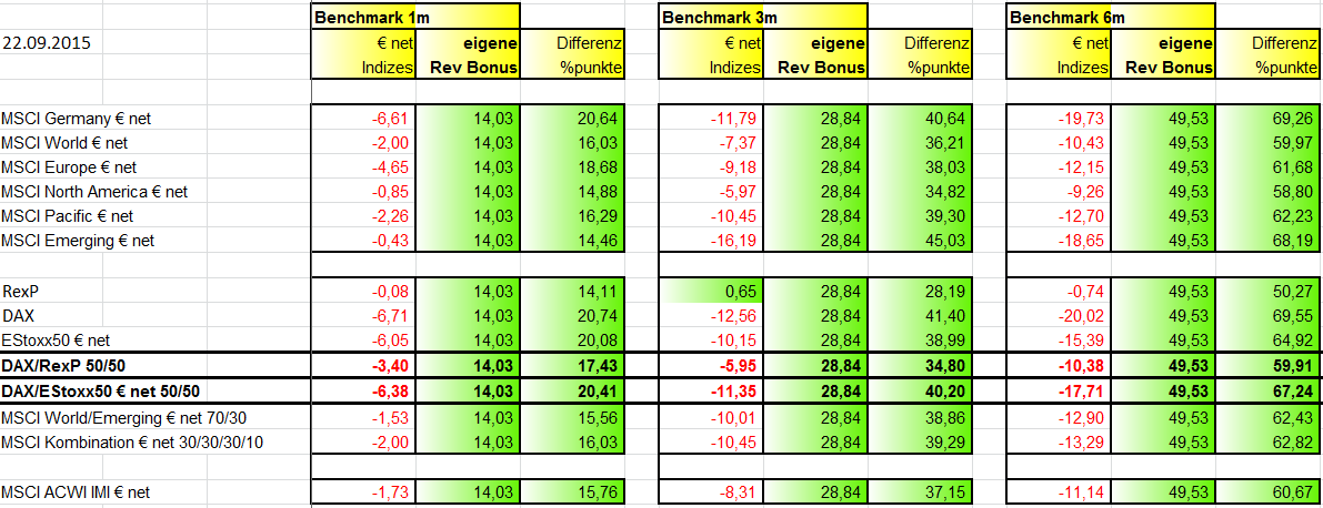 Einzige eigene Anlageklasse in einem satten grün gegenüber allen von mir genutzten Benchmarks: Reverse Bonus Cap, trotz deftiger zwischenzeitlicher (realisierter und virtueller) Verluste.