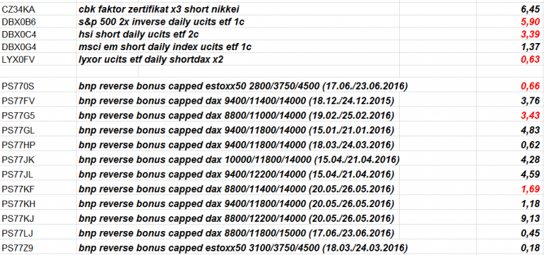 Neben den Reverses (nur auf den DAX) werden z.Zt. als short-Instrumente lediglich die folgenden gehalten: