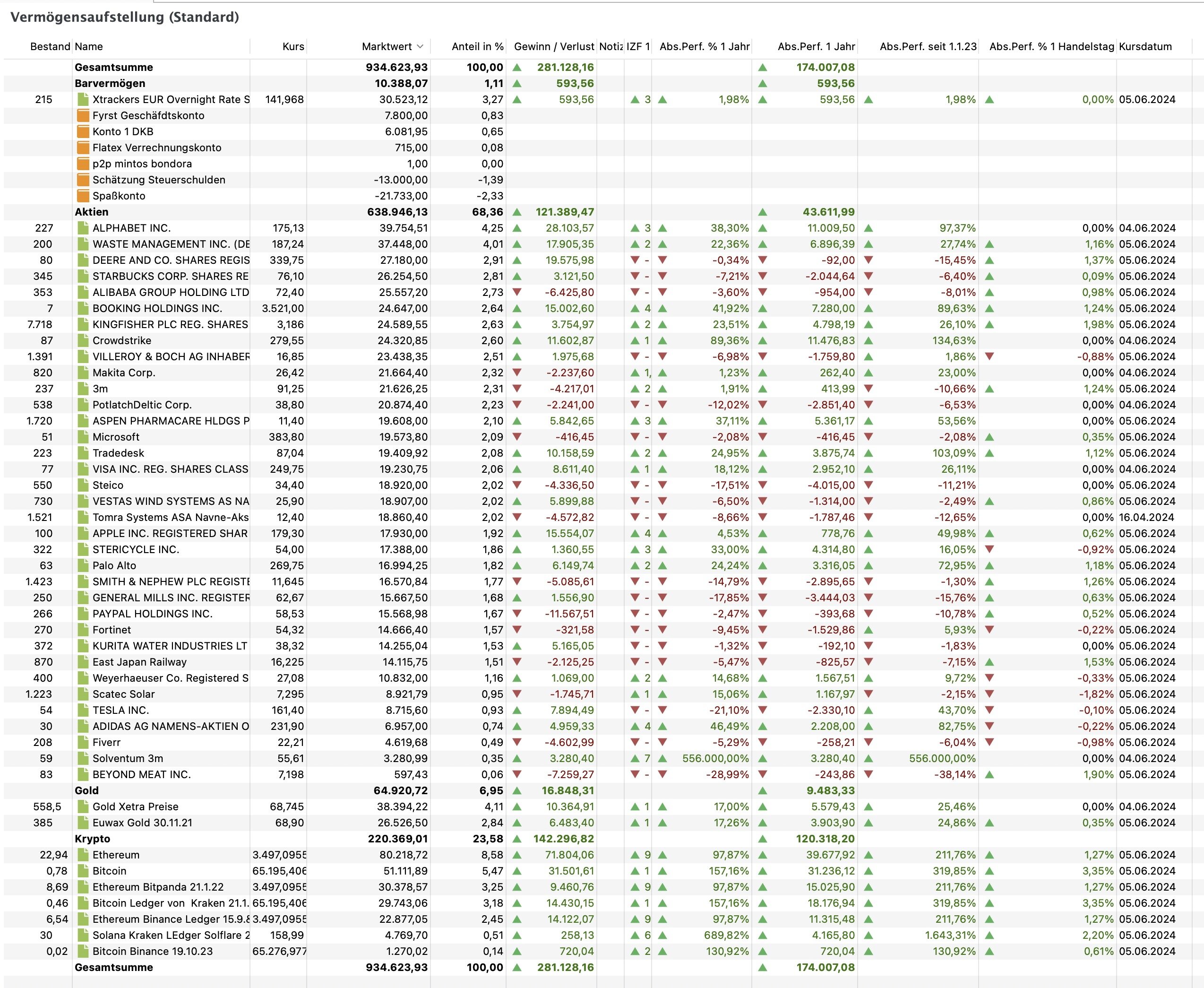 wertomat Juni 3, 2024 https://www.msn.com/de-de/finanzen/top-stories/stericycle-aktie-schießt-hoch-waste-management-mit-milliardenübernahme/ar-BB1nxAhy Gerade gelesen. Waste Management, meine zweitgrößte Position, kauf Stericycle, die ich auch im Portfolio habe. Wenn daraus eins wird, wäre es mir mit über 50.000 Euro etwas zu hoch gewichtet in meinem Portfolio. Da ich ja jetzt eh mal wieder was schreibe, ein kurzes Update. Im Januar und Febraur war mein Aktienportfolio deutlich hinter einem MSCI World (ca. Null vs. plus 7 Prozent) und hängt dem MSCI World als "falscher Referenzwert" seitdem um diese ca. 7% hinterher. Crypto ging natürlich ab wie Schmidts Katze. 1.1.24 bis heute: Meine Cryptos: +66,4% Gold +15,3% Meine Mischung Aktien Crypto Gold: + 15,5 % MSCI World: + 10,4% Mein Aktienportfolio: 4,4% In der Summe eine ganze Menge Asche. Kann alles schnell wieder fallen, aber gefühlt nähert sich der Punkt, wo mein Porfolio 7-Stellig wird (man muss dann eigentlich ne Parry fürs Forum schmeißen oder), und das keine 10 Jahre nachdem ich hier im Thread meinen ersten Beitrag über meine ersten 30.000 Euro geschrieben habe. Diesen Beitrag teilen Link zum Beitrag