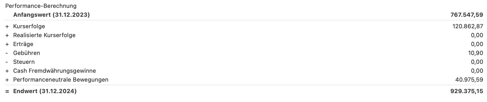 wertomat Juni 5, 2024 vor 1 Minute von Glory_Days: Was mich interessiert, ist wie sich der Endwert in selbst eingebrachtes Kapital und Kursgewinne aufteilt. Ich vermute, dass du selbst eingebrachtes Kapital in der oben angegebenen Periode als "Performanceneutrale Bewegung" Bewegung bezeichnest. Hast du dafür auch eine Gesamtübersicht über den gesamten Anlagezeitraum? Die Tabelle ist aus Portfolio Performance und "performanceneutrale Bewegungen" beschreibt wie Du richtig vermutest das selbst eingebrachte Kapital. Über den gesamten Zeitraum sehe ich es in meiner Vermögensaufstellung in Portfolio-Performance unter Gewinn/Verlust. Kann sein, dass es ein paar kleine Fehler gibt in der Tabelle, da ich nicht weiss, ob z.B. komplett verkaufte Akiten oder Coins in dieser Berechnung noch berücksichtigt werden, aber da ich vor allem Buy and Hold mache sollte es in etwa stimmen. Konkret heisst das, dass beim Gesamtvermögen von 934.000, davon 281.000 Euro Kursgewinne sind, davon 140.000 bei (viel geringer als Aktien gewichteten) Kryptos, und 120.000 bei Aktien.. Diesen Beitrag teilen Link zum Beitrag