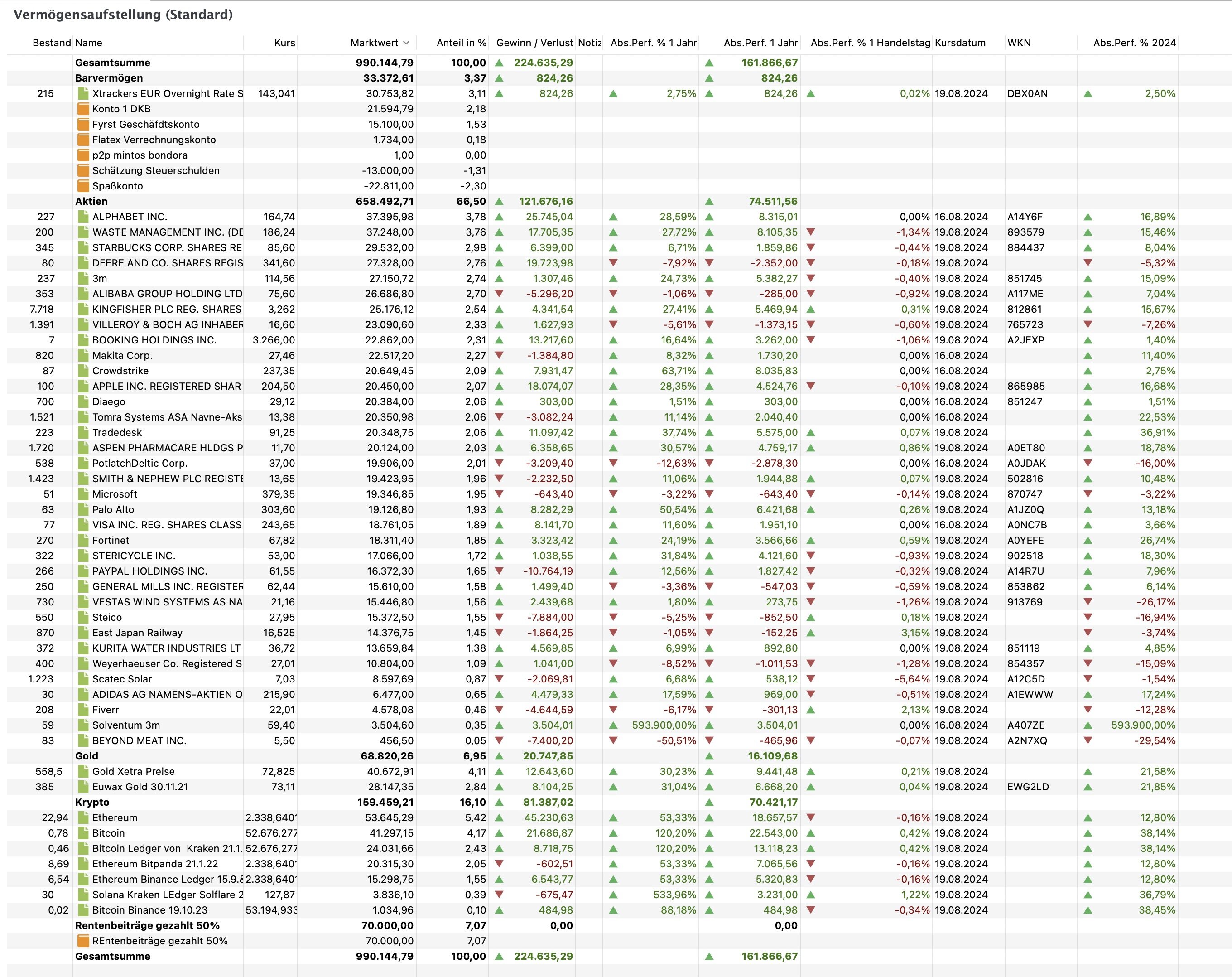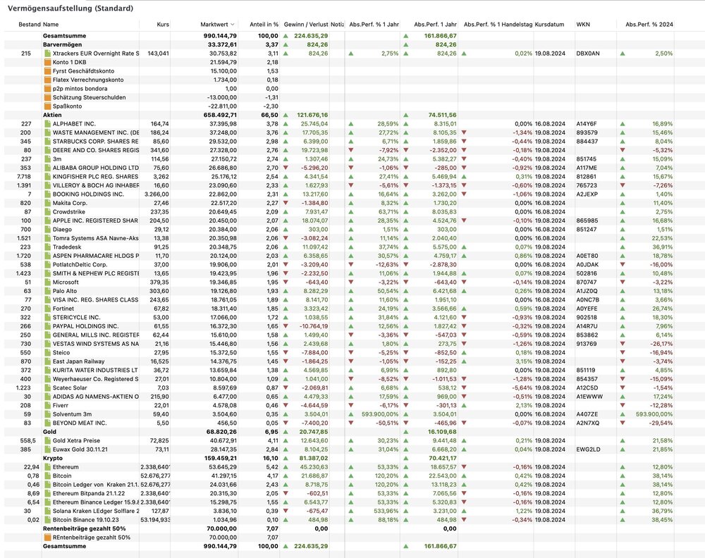 wertomat August 19, 2024 Tesla ist verkauft. Ich hatte hier einen Beitrag aufgemacht, wie ich meine Rentenpunkte bewerten sollte. Ich finde es derzeit richtig, sie in meinem Gesamtvermögen mit aufzuzählen. Allerdings bin ich unsicher, und habe sie daher sehr stark kleingerechnet. Ich habe nur 50% der eingezahlten Beiträge als Wert ins Portfolio geschrieben. Also 70.000 Euro, was immernoch sehr viel ist für eine Änderung der Gesamtsumme innerhalb eines Tages. Alternativ hätte ich auch, wie im verlinkten Thread empfohlen, jeden Rentenpunkt (entsprechend aktuellem "Kaufpreis") mit 8426 Euro bewerten können, und wäre bei 169.000 Euro für 20 Rentenpunkter gelandet. Aber ich wollte jetzt auch nicht direkt durch einen Buchführungstrick zum Millionär werden. Andere zählen sie gar nicht zum Vermögen. Ich habe sozusagen erstmal die Mitte gewählt. Ich muss mal sehen, wie sich die Notierung in Portfolio Performance auf meine Finanz-planungen, -gedanken etc auswirkt. Anbei eine aktuelle Gesamtübersicht. Diesen Beitrag teilen Link zum Beitrag
