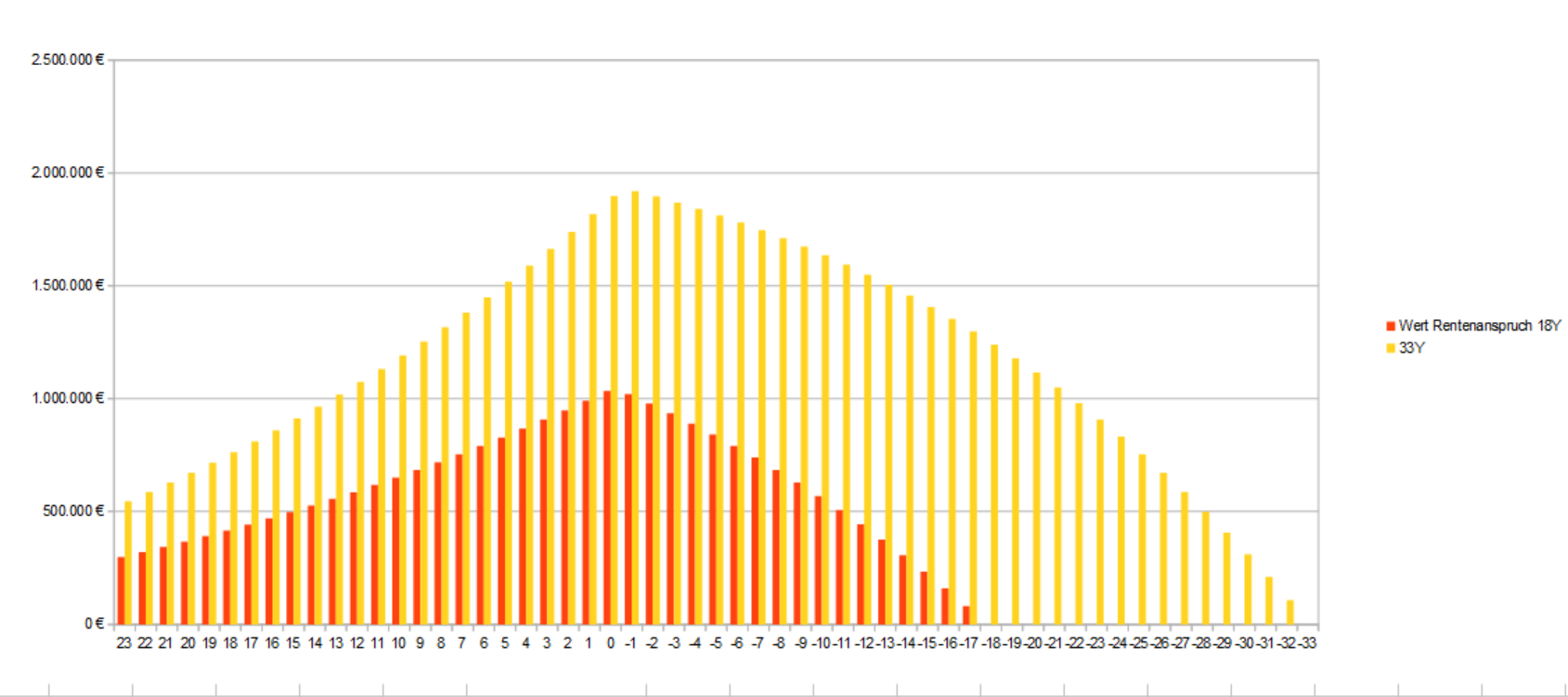 LongtermInvestor August 23, 2024 · bearbeitet August 23, 2024 von LongtermInvestor Ob man die Rentengegenwerte in der Einzahlungsphase so "genau" tracken muss ist Geschmackssache, ich halte dies eher als Hinweis/Argument für die AA (höherer Aktienanteil möglich) für hilfreich. Ich halte den Wert in einem separaten Portfolio in PP nach und update den einmal im Jahr. Der spätere Wert hängt ganz zentral von der realisierten Lebenserwartung an - hier ein Beispiel für eine mittlere Lebenserwartung ab Renteneintritt und eine lange. Annahmen: Rentenpunkte heute: 37, Anstieg um 2 RP pro Jahr bis Renteneintritt. Jährlich 2% anstieg Wert je RP. Wert Rentenpunkte: 12xRPxLebenerwartungxRW je Punkt Diesen Beitrag teilen Link zum Beitrag