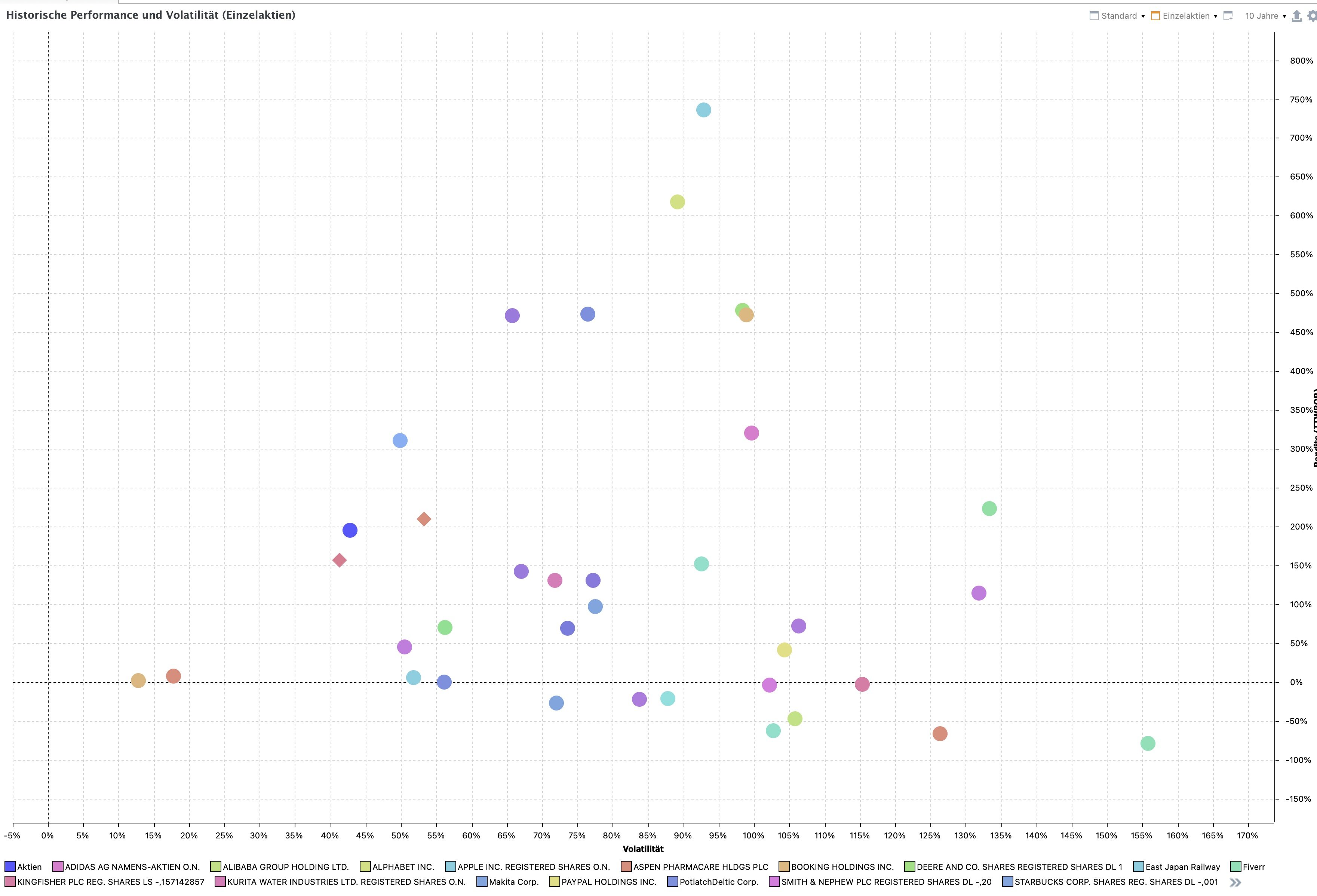 wertomat Dezember 6, 2024 Gibt es die Portfolio-Vola ausschließlich unter "Rendite/Volatilität", was ich sehr unübersichtlich finde? (Ich hatte im Portfolio Performance Thread vorgestern dazu gefragt). Hier wäre das (auf 10 Jahre und nicht wie in der Zuletzt geposteten Übersicht auf 4 Jahre). Meine Aktien sind der dunkelblaue Punkt, der am weitesten Links ist - die Raute direkt drunter ist Gold, und die Raute direkt rechts davon ist der Msci World. Insgesamt sind meine Aktien in 2024 bisher mit plus 18% deutlich schlechter gelaufen als der MScI World (plus 29%). Das aktuelle Jahr ist deutlich für die Underperformance gegenüber dem MSCI World auf die letzten 10 Jahre verantwortlich. Diesen Beitrag teilen Link zum Beitrag
