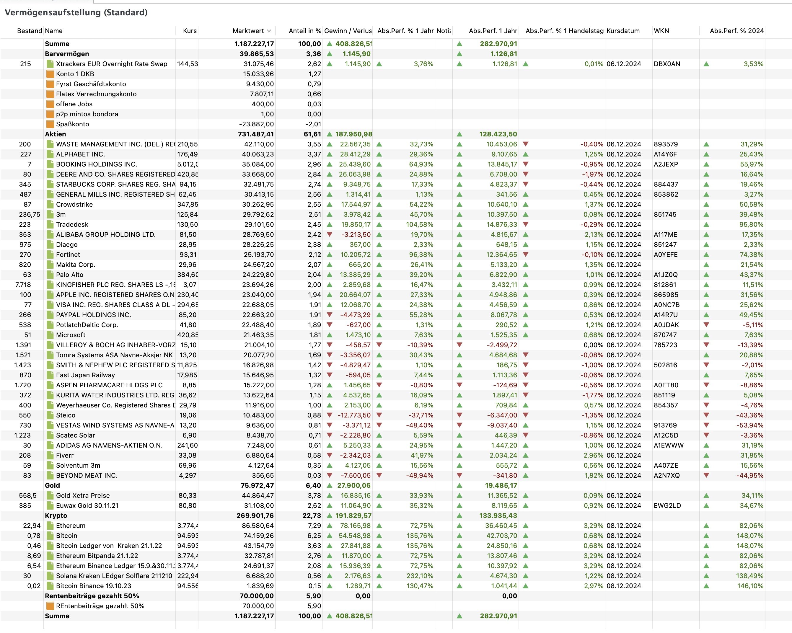 wertomat Januar 2, 2025 · bearbeitet Januar 2, 2025 von wertomat So, frohes neues und kurzer Jahresrückblick: Das schlechteste zum Anfang: Mein Aktienportfolio hat gegenüber dem MSCI World mega underperformt - aber das wurde glaube ich vor ein paar Wochen hier schon besprochen. . Jetzt alles gute: . Meine Aktien plus 13%, meine Krypto +85%, mein Gold +34,5%, meine Mischung aus allen dreien +26% . Das geilste ist die absolute Zahl: -Vermögenszunahme plus 347.000 Euro (wobei ich 70.000 Euro gezahlte Rentenbeiträge erstmalig mit reingeschrieben habe) -Gesamtvermögen damit erstmal über 1 Millionen Euro -Mit dem Aktienanteil alleine (ohne Krypto und Gold und Fiat) bin ich vermutlich "finanziell unabhängig" genug für ein Leben mit dem ich finanziell zufrieden sein könnte. Diesen Beitrag teilen Link zum Beitrag