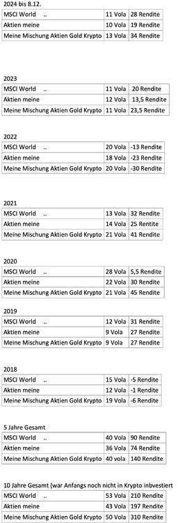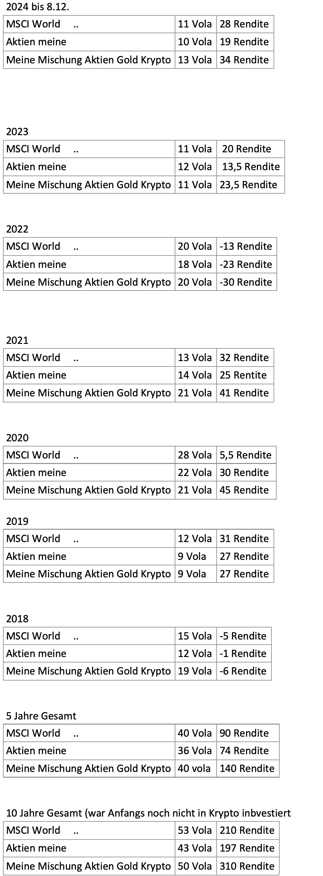 wertomat Dezember 8, 2024 · bearbeitet Dezember 8, 2024 von wertomat Ich habe mir die Werte jetzt tatsächlich zum Spaß mal für die letzten 6 einzelnen Jahre sowie für einen 5- und 10-Jahreszeitraum die Werte für Volatilität und Rendite anzeigen lassen - einmal für dne Msci World, dann für meine Aktien, und dann für meine Mischung aus Aktien, Krypto und Gold. Interessant finde ich die starke Tendenz -dass mein Portfolio weniger Rendite als der MSCI World hat, aber auch weniger Volatilät (vor allem letzteres war mir nicht bewußt) -das meine Mischung aus Aktien etwas Gold und einiges Krypto gut für REndite gesorgt hat, aber nur eine Volatilität in etwa vom MSCI World hatte. Was heisst das jetzt für die Zukunft: -Vielleicht nichts: 1.Weil Performance der Vergangenheit wenig über die Zukunft voraussagt. 2. Weil Punkt 1 noch viel stärker für Krypto gilt, und da hab ja einiges 3. weil ich selbst vielleicht bei der Aktienauswahl manches bedenke, was dem MSCI World egal ist. -vielleicht auch, dass ich eine Portfolio-Umstrukturierung, um Volatilität zu reduzieren, recht entspannt angehen kann Irgendwie aber auch wieder psychologisch auffällig, dass mir meine Volatilität nicht mehr so hoch vorkommt, nur weil die des MSCI World höher ist : ) Alle Zahlen stehen für Prozentwerte Diesen Beitrag teilen Link zum Beitrag