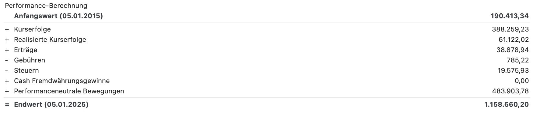 McScrooge Januar 5, 2025 vor 12 Stunden von wertomat: Hier noch mal eine Tabelle über 10 Jahre: Kann sein, dass sie in der Anfagszeit etwas verfälscht ist, da ich vermutlich noch keine 10 Jahre Portfolio Performance nutze, und nicht mehr genau weiss, wie ich die Aktien damals eingebucht hatte. Glückwunsch! Ja, das sieht gut aus. Eben dieses Problem habe ich auch, da eben in der Zeit vor PP eben auch Gewinn angefallen ist, der dann wieder investiert wurde, sind diese Langfrist-Vergleiche nie ganz korrekt. Aber was soll’s „wichtig ist, was hinten rauskommt“ Diesen Beitrag teilen Link zum Beitrag