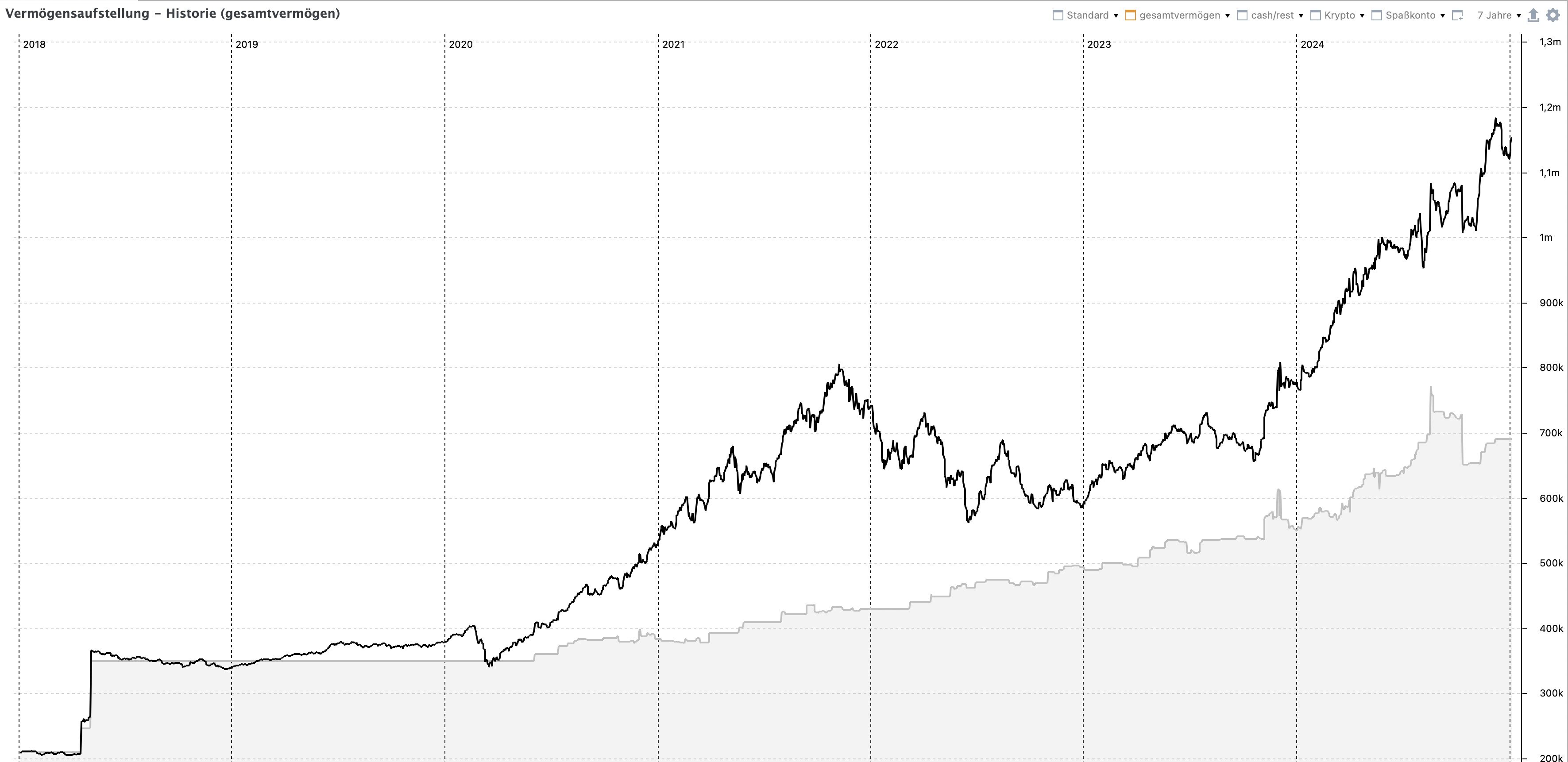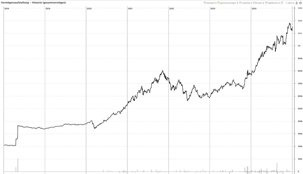 s1lv3r Januar 4, 2025 Am 2.1.2025 um 04:56 von wertomat: Das geilste ist die absolute Zahl: -Vermögenszunahme plus 347.000 Euro (wobei ich 70.000 Euro gezahlte Rentenbeiträge erstmalig mit reingeschrieben habe) -Gesamtvermögen damit erstmal über 1 Millionen Euro -Mit dem Aktienanteil alleine (ohne Krypto und Gold und Fiat) bin ich vermutlich "finanziell unabhängig" genug für ein Leben mit dem ich finanziell zufrieden sein könnte. Wow, auch von mir herzlichen Glückwunsch. Habe es gerade erst durch den Depotvermögen-Thread gesehen, aber eine absolut bemerkenswerte Entwicklung. Wenn ich es richtig erkannt habe, besteht dein Gesamtvermögen, trotz der Hausse der vergangenen Jahre, trotzdem nur zu rund 1/3 aus Kursgewinnen. Wenn man sich also fragen sollte, wie du es zum Millionär gebracht hast, dann müsste man (trotz z.B. der beachtenswerten Entwicklung deiner Krypto-Investitionen) wahrscheinlich rekapitulieren, dass du das vor allem durch eine beeindruckende Sparanstrengung über ein komplettes Jahrzehnt geschafft hast und viel weniger durch irgendwelche klugen Spekulationen, oder wie würdest du das sehen? Diesen Beitrag teilen Link zum Beitrag