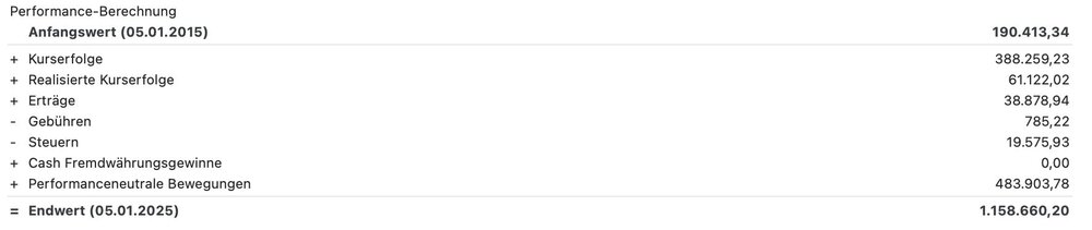 wertomat Januar 4, 2025 · bearbeitet Januar 4, 2025 von wertomat In der Vermögensaufstellung vom 9.12. auf dieser Seite weiter oben stehen die Kursgewinne mit insgesamt zu dem Zeitpunkt 408.000 Euro drin (heute sind´s nur noch 380.000, Hallo Volatilität). Ohne die Kursgewinne wäre ich also längst nicht so weit. Von diesen Kursgewinnen sind (lässt sich auch in der Tabelle erkennen) ca. 40% durch Krypto. . -Wie geschrieben, sind jedoch Gewinne aus nicht mehr gehaltenen Positionen hier nicht mit enthalten. Insgesamt habe ich vermutlich maximal 50.0000 Euro zusätzlich durch Kursgewinne nicht mehr gehaltener Positionen im Vermögen. -Vermutlich gab es auch ein paar verfälschende Buchungsfehler (z.B. ein paar Mal Käufe erst manuell eingebucht, dann versehentlich durch PDF Import ein zweites Mal eingebucht, und dann einfach irgendwie wieder ausgebucht und dabei evt. die Performance verfälscht ) -Weiss jemand, wie ich in Portfolio Performance die Gesamtsumme meiner Gewinne inkl "nicht mehr gehaltener Positionen" anzeigen lassen kann? Unter "Trades" geht das einzeln, dann müsste ich manuell addieren. -Bei Krypto hatte ich natürlich Glück, aber mein Aktienportfolio liegt in der Performance über die letzten 10 Jahre ungefähr auf Höhe eines MSCI World bzw. sogar leicht drunter - ich bin also niemand der sein Vermögen durch eine Überperformance bei Aktien aufgebaut hat. Ps: Hab jetztz gerade den Hinweis auf die Datenreihe "Investiertes Kapital" gesehen. Hier: Diesen Beitrag teilen Link zum Beitrag