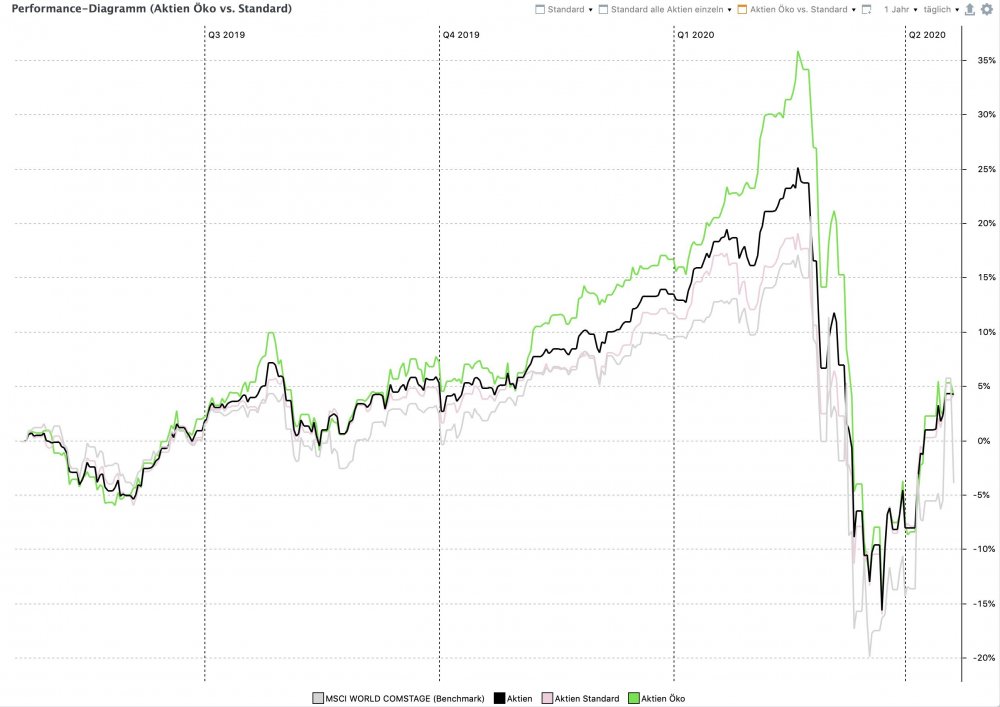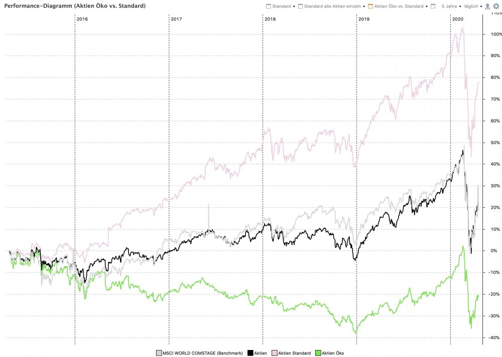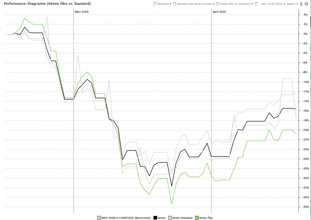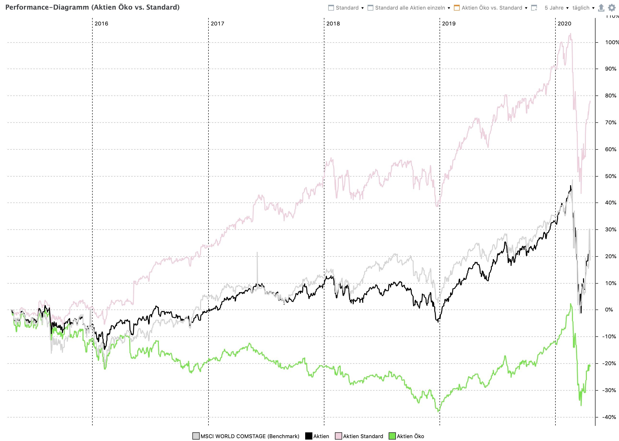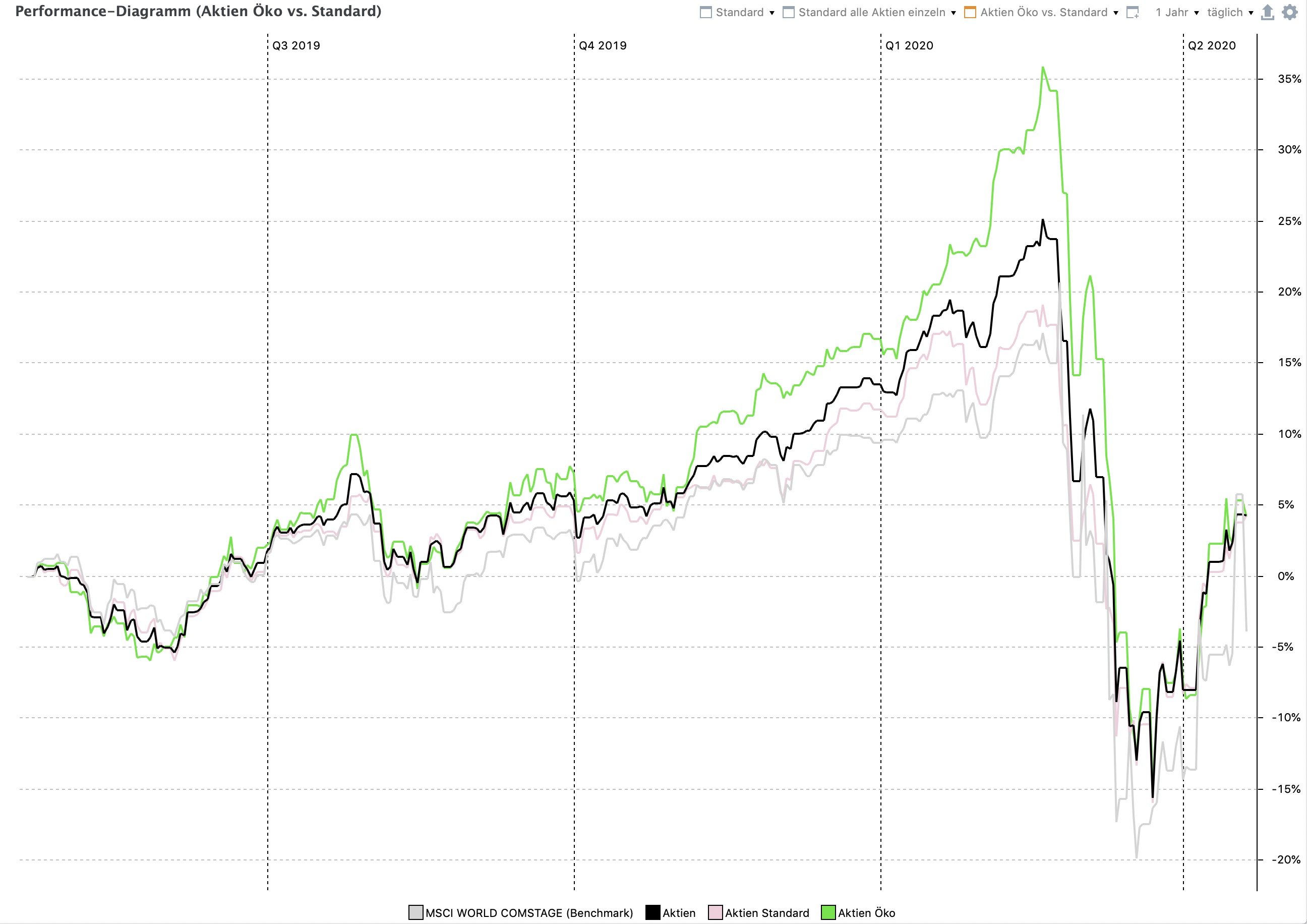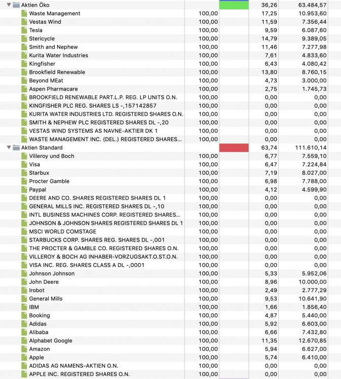 wertomat April 20, 2020 · bearbeitet April 20, 2020 von wertomat Wo ich mich etwas in Portfolio Performance eingearbeitet habe, habe ich mal mein Aktienportfolio in "Öko-Werte" und "Standard-Werte" unterteilt. Auch weil ich anstrebe, langfristig ein Portfolio aus "Öko-Werten" zu haben, das nicht schlechter performt als ein Standard-Portfolio. Das die Abrenzung zwischen den Kategorien nicht immer eindeutig sein kann, ist klar, und muss an dieser Stelle vielleicht nicht diskutiert werden. Ich habe mit folgender Aufteilung gearbeitet (die Firmen mit Wert Null stehen da, weil ich PDFs mit Dividenden imnportiert habe, und die Firmen dabei neu angelegt wurden. Muss ich noch zusammeführen). Was mir auch aufgefallen ist, ist, dass ich in absoluten Geldsummen immernoch fast doppeklt so hoch in Standard-Werte investiert bin wie in Öko-Werte - vermutlich war ich gerade bei den Nachkäufen eher vorsichtig. Die folgenden beiden Tabellen gehen davon aus, dass ich alle Werte schon mit der jetzigen Summe an Aktien einige Jahre halte (ich wusste sonst nicht, wie ich die Aktien ohne mega viel Zeitaufwand in Portfolio Performance bekommen habe. Die erste Tabelle ist über den Zeitraum von 5 Jahren: Grün = Öko, Rosa = Meine Standard Aktien Schwarz = meine Aktien gesamt Grau = Vergleichs -ETF MSCI World Comstage (ich hoffe der ist ausschüttend, sonst wäre da eine Verzerrung) Hier hat mein Öko-Portfolio Underperformt, mein Standard-Portfolio Überperformt, und insgesamt war ich nahe der Benchmark. __________________________ Jetzt das gleiche für 1 Jahr: Hier har mein Öko-Portfolio überperformt, insgesamt bin ich Nahe der Benchmark. _________________________ Und hier der Graph seit Beginn der Krise (ab 15.2.) ______________ Ich habe noch ein paar andere Vergleichszeiträume angeschaut. Insgesamt scheint das grüne Portfolio in 2017 und 2018 schlechter gelaufen zu sein, und in 2019 ähnlich wie der Vergleichsindex. Auf jeden Fall bin ich überrascht, dass die Graphen doch so stark auseinandergehen. Und auch überrascht, das nicht nur mein grünes Portfolio 2017/18 so stark underperformt hat, sondern auch, das die von mir gehaltenen Standart-Werte so stark überperformt haben. Hier muss ich noch mal genauer hinschauen. Vermutlich gibt es eine leichte Verzerrung (nicht für das gesamte Portfolio wenn man es so gehalten hätte, sondern für meinen Kontostand), der dadurch entsteht, dass hier vor allem im 5-Jahres-Chart einige Aktien sind, die ich in Wirklichkeit damals noch nicht hielt, sondern diese erst nach stärkerem Anstieg gekauft habe. Diesen Beitrag teilen Link zum Beitrag