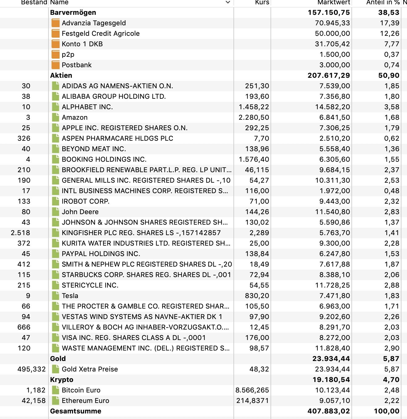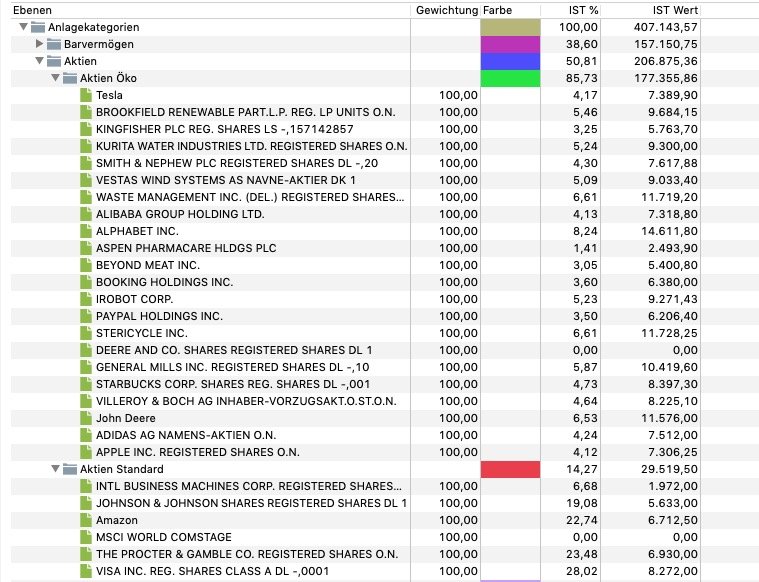 wertomat Juni 9, 2020 Nein die Aufstellung ist tatsächlich sehr willkürlich, und ein anderer Begriff wäre zielführender gewesen. Alibaba, und Google sind gewiss keine Öko-Aktien. Das was hier Barvermögen heisst, ist eigentlich vor allem alles, was Zinsen gibt. Auch hier ist der Begriff irre führend. Als ich Portfolio Performance, woraus die Screenshot sind, angelegt hatte, war mir nicht klar, dass ich die Screenshots posten würde. Hier eine komplett Aufstellung: Gold halte ich auch nicht als Xetra, sondern als Münzen. Ich habe nur die Werte der Münzen ungefähr in Xetra Gold umgerechnet, um den Wert grob dazustellten (weil ich keine Datenbasis für Gold-Münzen kenne, die Portfolio Performance nimmt. Diesen Beitrag teilen Link zum Beitrag