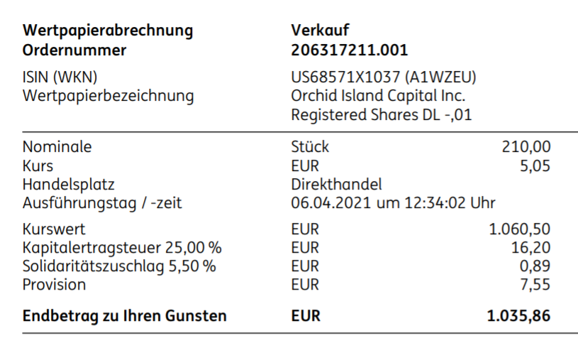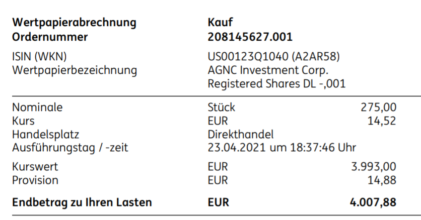 Sascha1982 April 24, 2021 · bearbeitet April 24, 2021 von Sascha1982 Am 11.2.2021 um 23:38 von Sascha1982: Habe mir heute als kleinen Zock "Orchid Island Capital" (WKN: A1WZEU) zu 4,6705€ ins Depot geholt. Sehr hohe Dividende (aktuell ca. 13,5%) bei monatlicher Ausschüttung (interessant sofern ich die Position etwas länger im Depot halten sollte). Ich würde die Position allerdings wieder abstoßen, sofern ich mit ca. 8 bis 10 Prozent im Plus bin. Ansonsten ist der Plan, die Aktie einfach zu halten und mich an den Dividenden zu erfreuen. Habe in den letzten Tagen leider sehr viel Stress gehabt - daher hier das Update: Nachdem ich Orchid Island Capital am 11.02. gekauft hatte - habe ich (mit irgendeiner Vorahnung auf die Kurskorrektur) am 06.04. zu 5,05€ verkauft. In knapp zwei Monaten rund 7,5% gemacht - das ist OK. Nachdem die Korrektur dann erfolgt ist, bin ich gestern mit einer größeren Position eingestiegen - zu einem Preis von 4,48€ habe ich mir dann 1000 Stück ins Depot geholt. Sofern die Dividende nicht gekürzt (oder ausgesetzt) wird, wäre ich bei rund 14% Dividende. Ist zwar aufgrund schlechter Zahlen ein gewisses Risiko - aber manchmal muss man auch was riskieren. Und wo ich schon auf Shoppingtour war, habe ich noch 300 SLR Senior Investment Corp. zu je 13,274€ gekauft. Dem folgten 374 PennantPark Floating Rate Cap. zu je 10,64€ Last but not least sind noch 275 Anteile der AGNC Investment Corp. zu je 14,52€ ins Depot gewandert. Diesen Beitrag teilen Link zum Beitrag