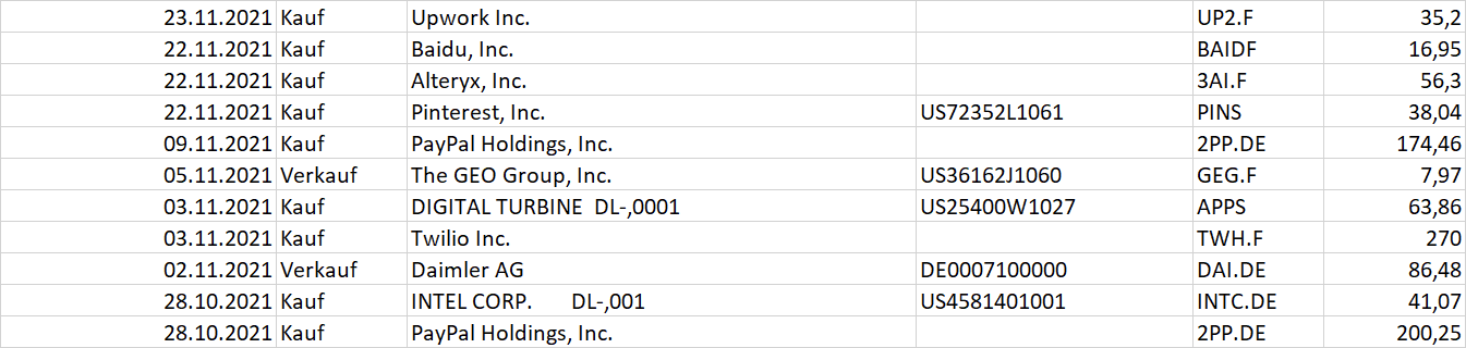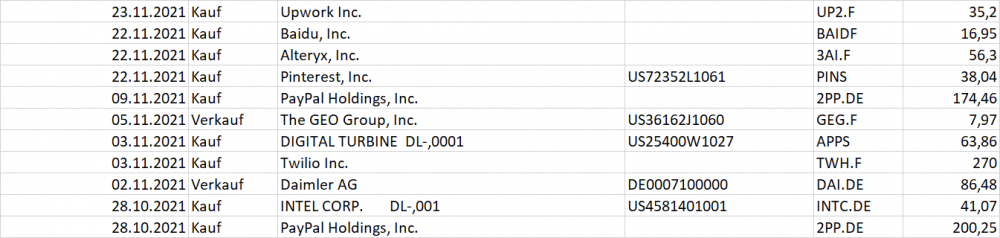 Soundwave November 23, 2021 · bearbeitet November 23, 2021 von Soundwave Upwork: Hohes Potential, hohes Risiko - zusätzlich zu meiner Position Fiverr (Unterschiedliche Auftraggeber und Kunden ergänzen sich gut - ggf. in ferner Zukunft Übernahme / Fusion denkbar) Baidu: Einige interessante Projekte wie autonomes Fahren / AI, nach Stagnation der letzten Jahre deutliches Aufwärtspotential, gute Kontakte zur Regierung (Regierungsaufträge) Alteryx: Nachkauf - Bedarf für einfach anpassbare Analysesoftware ist aus meiner Sicht eine Killeranwendung und die Auswertung von Kennzahlen wächst in jedem Unternehmen / Wachstum von Alteryx eher bescheiden, aber neuem Management traue ich langfristig viel zu Pinterest: Nachkauf - ausreichend Monetarisierungspotential außerhalb USA - Zielgruppe meiner Ansicht nach beschränkt aber ausreichend Paypal: Nachkauf - Gründe siehe Erstkauf unten Geo Grup: Mit noch relativ geringem Verlust Ausstiegsmöglichkeit genutzt. Hier hatte ich die anstehenden Refinanzierungsschwierigkeiten der auslaufenden Anleihen stark unterschätzt, insbesondere dass Banken aus Reputationsgründen keine Anschlussfinanzierung gewähren / Insolvenzrisiko 2022 zu groß Digital Turbine: Neben der Position von Trade Desk, den Rücksetzer als Einstieg in das Handy-Werbegeschäft genutzt. Verlagerung der Werbung ins digitale Werbegeschäft sehe ich als einer der großen Zukunftsttrends. Bspw. wäre künftig irgendwann auch eine gedruckte Zeitungsausgabe mit persönlicher Werbung ausgerichtet auf den Abonennten möglich etc Twilio: Unternehmen top aufgestellt , agil und mit gutem Gespür, was Kunden wollen. Übernahme von Analyseunternehmen der Kundenstruktur sorgt für perfekte Synergien und ermöglicht für die Zukunft ganz andere Margen Daimler: Umbau Elektrofahrzeuge und Wettbewerb mit neuen Konkurrenten wird viel Geld verschlingen. Super gelaufen, deswegen einfach mal Gewinne vom Tisch nehmen. Als Zykliker kommt sicher die nächste Einstigesgelegenheit in ein paar Jahren Intel: Kleine Position als spekulative Turnaroundwette Paypal: Wollte ich eigentlich schon länger einsteigen. Wenn man sich die absoluten Nutzerzahlen sieht, immer noch viel Potential, ebenso bei Angriff auf klassische Geschäftsfelder von Zahlungsdienstleistern in einigen Jahren, allerdings auf Grund der starken und vielfältigen Konkurrenz genaue Beobachtung erforderlich Diesen Beitrag teilen Link zum Beitrag