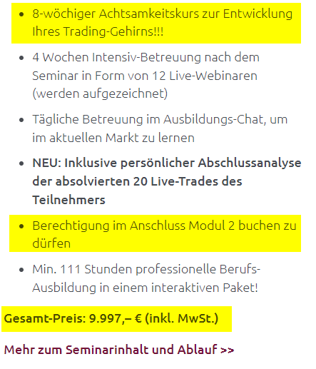 Schildkröte Dezember 7, 2023 · bearbeitet Dezember 7, 2023 von Schildkröte vor 8 Stunden von Cinquetti: Ist das wirklich ein professioneller Trader? Die Seminare auf seiner Website erinnern stark an Koko Petkov: Quelle: https://www.jay-medrow.com/seminare/ausbildung/ Du solltest die Frage anders formulieren: Ist das ein erfolgreicher Trader? Das wird er uns wohl nicht verraten. Ist das ein erfolgreicher Verkäufer? Wenn genügend Leute seine Seminare buchen, macht er bei so einem stolzen Preis einen ordentlichen Schnitt. Zudem bietet er noch die Vermittlung von Fremdgeld für Trader an? Ich werde demnächst mal nach Las Vegas fliegen und den Glücksspielern Privatkredite anbieten. Mal schauen, mit was für einer Rendite ich kalkuliere und was für eine Rückzahlungsquote ich tatsächlich erhalte. Diesen Beitrag teilen Link zum Beitrag