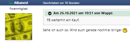 DAX43 Oktober 27, 2021 vor einer Stunde von Albanest: Put my money where my mouth is: (Wieder-)Kauf Facebook zu €271. Depotanteil 2.1% vor 40 Minuten von brandungsfels: Ebenfalls Kauf Facebook zu 271,4€. Depotanteil 2,08% Ich finde es super, wenn sich Anleger über die Größe einer Position, Gedanken machen. Diesen Beitrag teilen Link zum Beitrag