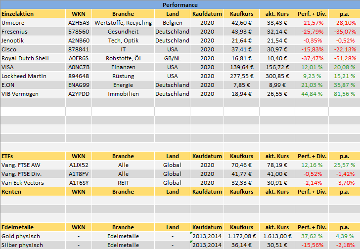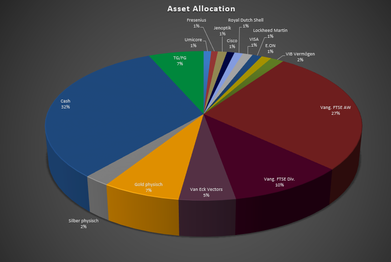 Layer Cake November 1, 2020 · bearbeitet November 1, 2020 von Layer Cake Maskierte Grüße, im letzten Monat ging es ein Stück nach unten. Der kurze Exkurs zu Carl Zeiss hat immerhin ein kleines Taschengeld abgeworfen. Ich merke schon länger, dass mir die Zeit fehlt, mich mit den Aktien zu beschäftigen. Wahrscheinlich muss ich mit den Updates etwas kürzer treten. Malschauen. Erstmal das Update für Oktober: Performance: Top & Flop: Käufe/Verkäufe: Verkauf Carl Zeiss Meditec zu 119,60 (+26%) Depotübersicht: Asset Allocation: Ausschüttungen diesen Monat: ETF Vanguard All World, ETF Vanguars AW High Div, Cisco Ausschüttungskalender: Ausschüttungen 2020: Grüße Der Kuchen Diesen Beitrag teilen Link zum Beitrag