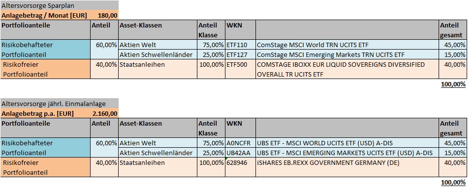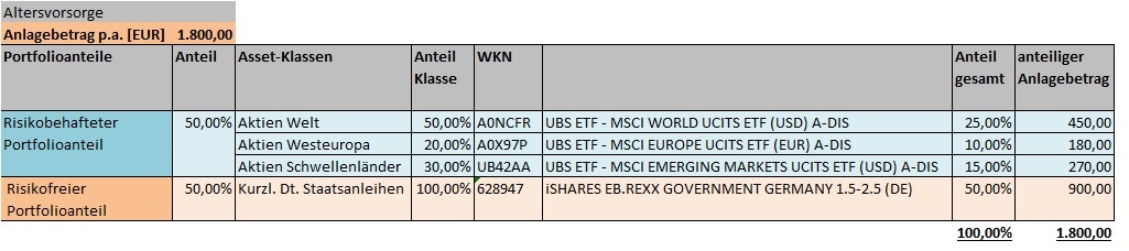 Spider00de Februar 26, 2015 Hallo zusammen, ich möchte mir ein langfristiges Depot mit ETFs zusammenstellen. Anbei findet ihr meine Eckdaten sowie eine Übersicht zu den ausgewählten ETFs und deren Gewichtung. Bei der Auswahl war es mir besonders wichtig, ausschüttende und steuereinfache ETFs auszuwählen. Als Anbieter kommt da anscheinend hauptsächlich die UBS AG in Frage. Als Vorbereitung für mein Vorhaben habe ich das Buch von Gerd Kommer gelesen. Zu der konkreten Auswahl und Zusammenstellung der ETFs wäre ich jedoch über ein Feedback sehr dankbar. Wie ihr in der beigefügten Datei sehen könnt, möchte ich mit einer 50/50 Aufteilung starten. Diese Risikoteilung möchte ich dann aber mit den Jahren durch regelmäßiges rebalancing reduzieren. Pro Jahr möchte ich einen Betrag von EUR 1.800 in das Depot einzahlen. 1. Erfahrungen mit Geldanlagen: Keine 2. Zeitliche Aufwandsbereitschaft für eure Fondsanlage: jährliches rebalancing 3. Risikotyp/Risikobereitschaft/Umgang mit Verlusten: eher Risikoavers Optionale Angaben: 1. Alter 31 2. Berufliche Situation: angestellt 3. Sparer-Pauschbetrag ausgeschöpft? nein Über meine Fondsanlage: 1. Anlagehorizont langfristig 2. Zweck der Anlage: Altersvorsorge 3. Einmalanlage und/oder Sparplan? Anlagebetrag EUR 1.800 p.a. Besten Dank für die Unterstützung im Voraus! Diesen Beitrag teilen Link zum Beitrag
