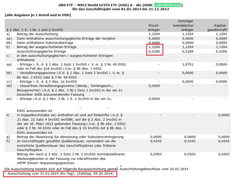 Spider00de März 3, 2015 Moin zusammen, zur Kontrolle des Steuerstatus hätte ich noch Fragen. Anbei findet Ihr den Auszug aus dem Bundesanzeiger zum ETF "UBS ETF - MSCI WORLD UCITS ETF (USD) A-DIS". Wenn ich es richtig verstanden habe, dann muss die Ausschüttung mindestens 40% der ausschüttungsgleichen Erträge betragen -> hier ca. 213% ? und die Ausschüttung vier Monate nach dem Geschäftsjahrende (31.12.2013) erfolgt sein -> hier der 31.01.2014 ? Ist das soweit korrekt? Diese beiden Kriterien habe ich hier im Forum gefunden. Wisst ihr, wo ich die entsprechende "Gesetzgebung" nachlesen kann? Gegen Änderungen seitens des ETF-Anbieters ist man wohl leider nicht geschützt. Aber wenn ich diesen Artikel hier lese, dann kann es einen in Zukunft mit den Comstage-ETFs genauso treffen! DANKE! Diesen Beitrag teilen Link zum Beitrag
