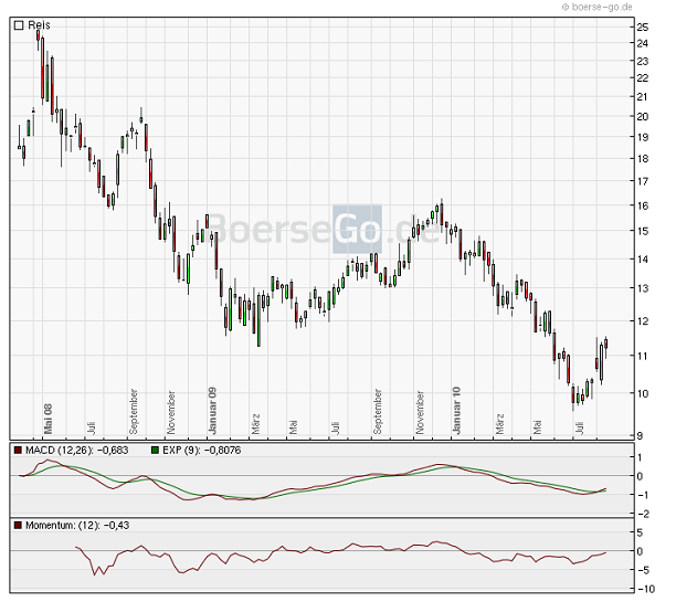markymark August 22, 2010 · bearbeitet August 22, 2010 von Chemstudent Ergänzung gemäß Richtlinien. Reis (engl.: Rough rice) ist eine von 7 Getreidearten (wie Mais, Weizen, Hirse, Roggen, Hafer), die zur Familie der Süßgräser (Poaceae) gehört. Die Pflanze, von den es zwei Arten gibt, den: "Oryza rufipogon" (einjährig, klassischer Wildreis) und "Oryza nivara" (mehrjährig), stellt für die Hälfte der Weltbevölkerung die Haupternährungsgrundlage dar. Obwohl Reis damit das wichtigste Grundnahrungsmittel weltweit ist und auch auf allen Erdteilen angebaut wird, gehört der Futurehandel zu den unbedeutendsten und wenig liquiden Rohstoff-Kontrakten. Gehandelt wird Reis an der CBOT. Den Rohstoff Reis halten ich momentan für interessant. Gerade auch vor dem Hintergrund von zur Zeit wuchernden Naturkatastrophen. Ist natürlich zur Zeit ein heikles Thema, während Millionen Menschen um ihr Überleben kämpfen, machen sich andere Gedanken über die Entwicklung des Reispreises. Ich möchte hier bitte nich falsch verstanden werden. Neben den bekannten Katastrophengebiet Pakistan gibt es auch Probleme in China. http://www.boerse-go.de/nachricht/Pakistan-Flutschaeden-reduzieren-Reisexporte,a2275114.html Der Chart sendet hier langfristig erste Kaufsignale mit positiv kreuzendem MACD und steigenden Momentum Hier ein Indexzerti dazu: http://zertifikate.onvista.de/snapshot.html?ID_INSTRUMENT=19794473&SEARCH_VALUE=DE000AA0WT48 Diesen Beitrag teilen Link zum Beitrag