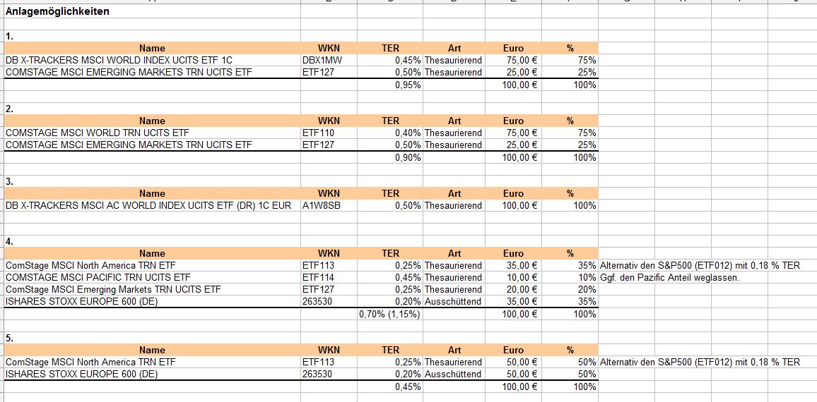 Ich persönlich bevorzuge aufgrund der Kosten, Anbieterdiversifikation und dem ausschüttenden ETF Variante 4 (ohne Pazific) oder 5.