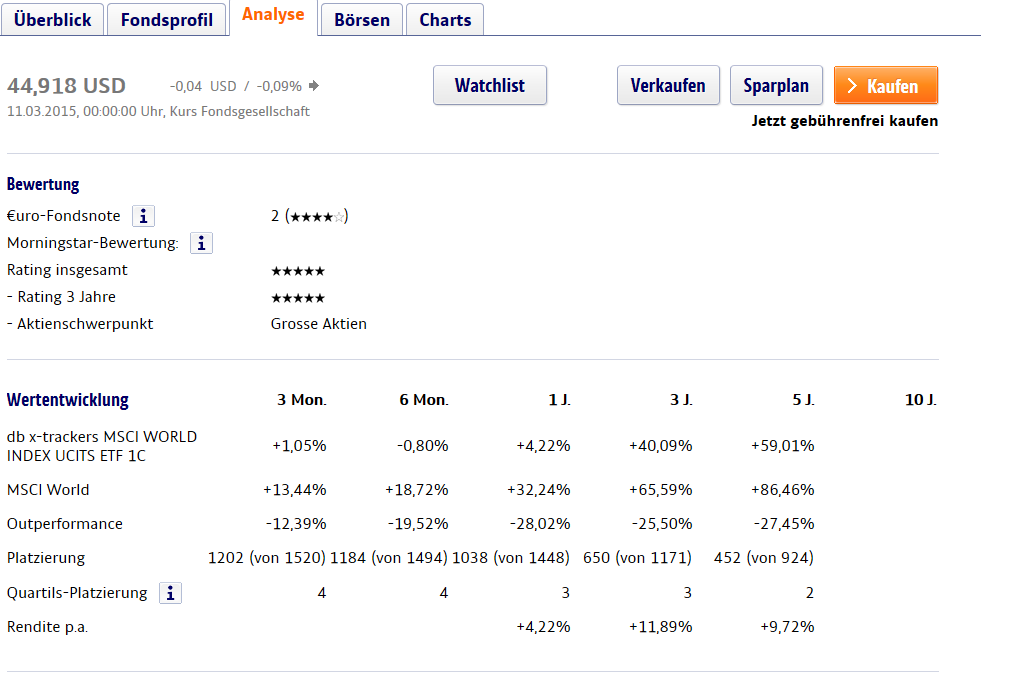 Ndemi März 13, 2015 · bearbeitet März 13, 2015 von Ndemi Habe mal eine Frage zu der im Anhang befindlichen Analyse: Bereich Wertentwicklung: Soll das bedeuten, das der MSCI World Index deutlich starker perform als der ETF von db-trackers? Wie geht das, wenn db-trackers doch den MSCI World Index abbildet? Demzufolge ist dann die Überrendite auch stark im Minus? Wäre net, wenn das mal jemand genauer erläutern könnte, was diese Bild aussagt. geht um WKN: DBX1AP | ISIN: LU0322253229 Das Chart zeigt mMn nämlich das der MSCI World Index deutlich geschlagen wurde ?! Vielen Dank! Diesen Beitrag teilen Link zum Beitrag