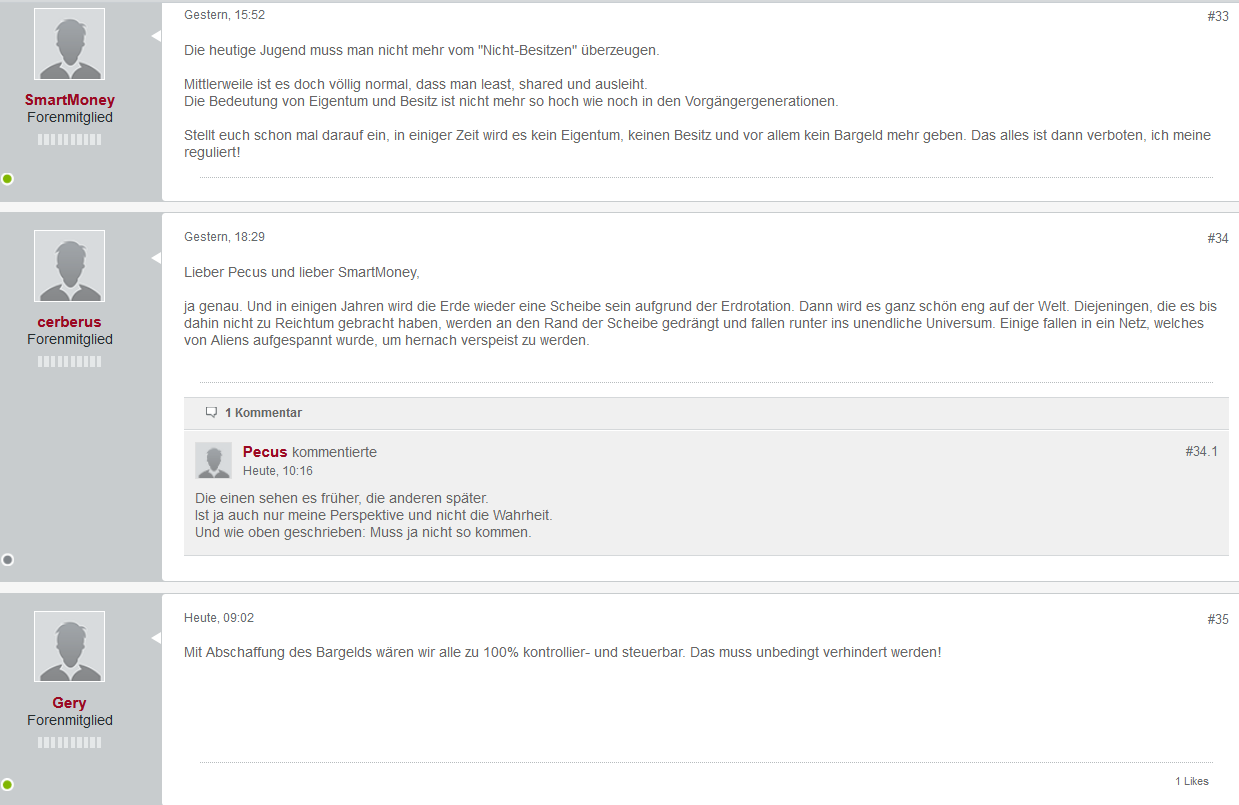 hutchence März 25, 2021 · bearbeitet März 25, 2021 von hutchence Neues aus der Anstalt: Die Äußerungen bzgl. Eigentum und Besitz bzw. der Trend zum Sharing oder auch zu immer weniger Bargeld sind zunöchst nicht zwingend falsch oder von der Hand zu weisen, nur werden immer neue Horrorszenarien aufgemacht. (Zum Thema Bargeld: Ich persönlich fühle mich wesentlich abhängiger, oder besser eingeschränkter durch Bargeld (Infrastruktur Geldautomaten, die Aufbewahrung/Transport des Bargeldes, insbesonere Münzen nervt, die Dauer des Bezahlprozesses, Gefahr des Verlierens usw... - sind alles First World Problems, ich weiß)) Die Menschen im DM-Forum müssen unglaublich ängstlich und pessimistisch sein. Der Beitrag vom user cerberus ist übrigens spitze :-) Diesen Beitrag teilen Link zum Beitrag