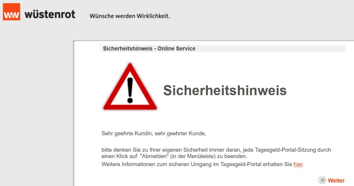 Wüstenrot Tagesgeld macht bei allen von uns in der Familie seit Sonntag immer noch massive Probleme beim Login.  Es kommt immer nur das sobald man sich einloggen will in Endlosschleife bei "weiter".