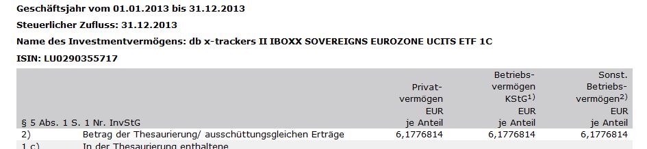 moonraker April 1, 2015 Vielen Dank Hellerhof. Du bringst mir Licht ins Dunkel Die von dir genannten Anleihe-ETF sind leider nicht bei der comdirect Aktion dabei. Der von mir (und auch von den Artikeln in FAZ und €uro am Sonntag) favorisierte db x-trackers II IBOXX SOVEREIGNS EUROZONE UCITS ETF (LU0290355717) hat im Bundesanzeiger in der letzten Veröffentlichung im Bundeanzeiger ausschüttungsgleiche Erträge. Damit ist er steuerhässlich - korrekt? Wenn nicht gleichzeitig noch eine genügend große Ausschüttung stattgefunden hat - JA. Auf Deinem Screenshot sieht man nicht alle Zeilen. Lt. Bundesanzeiger gab es aber keine zusätzliche Ausschüttung - also steuerhässlich... Diesen Beitrag teilen Link zum Beitrag