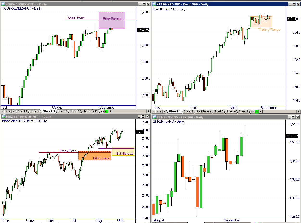 Falls der Index jedoch nur wenig abgibt, wird der volle Ertrag erzielt. Was liegt also näher, als gegen den Spread eine Nasdaq-Future-Long-Position zu setzen? Die Präsenz des Spreads ist eine hervorragende Absicherung gegen Kursverluste im Future. Und den Basisertrag liefert der Bull-Spread des Stoxx.