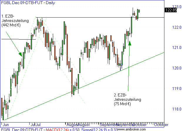 Diese "Tradingrange" hat rein optisch eine recht große Ähnlichkeit mit der gekennzeichneten Handelsspanne Anfang Oktober. Damals war dies eine Vorstufe für einen Ausbruchsversuch aus der ganz frischen Tradingrange aus dem Wochenchart.