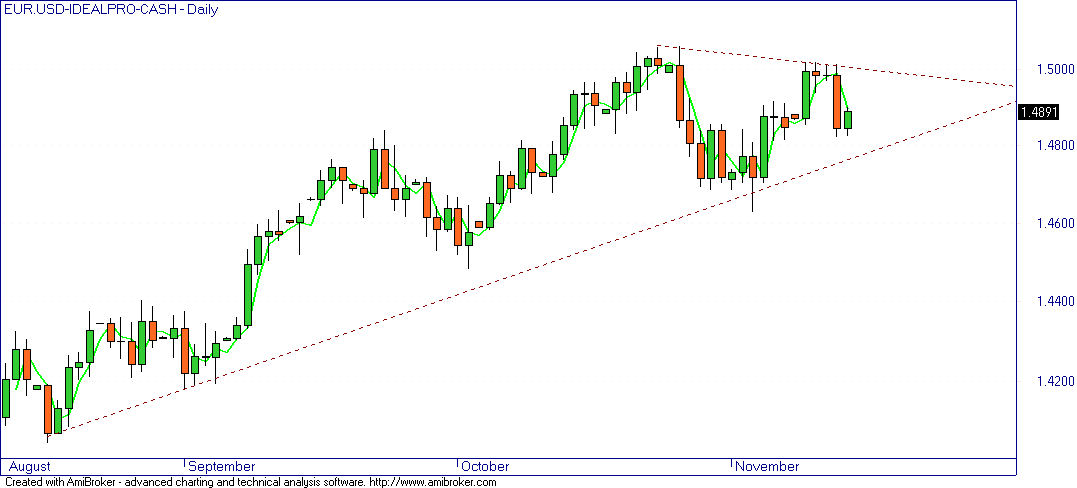 Man erkennt, dass die Tradingrange in Form eines zuspitzenden Dreiecks aufgelöst wurde.