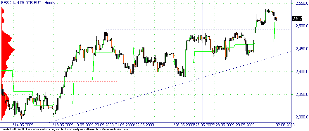 H.B. Juni 2, 2009 Hi, ein Update. Der gestrige Feiertagshandel hat die Seitwärtsphase seit dem 19.05. zunächst beendet. Häufig werden charttechnische Markten an umsatzschwachen Tagen durchbrochen. Es stellt sich dann stets die Frage nach der Nachhaltigkeit dieser Bewegung. So auch jetzt. Der heutige Pivot-Punkt liegt bei 2514 (im Stoxx-Future). Dies ist auch das Eröffnungsniveau. Solange die Kurse auf Stundenschlußkursbasis oberhalb dieses Niveaus verbleiben, ist dies eine Bestätigung des Ausbruchs. Das bisherige Verlaufshoch bei 2491 dient jetzt als Unterstützung. Long-Positionen kann man sinnvollerweise per Tagesschlußkurs auf diesem Niveau absichern. Das Chance-Risiko-Profil ist aktuell jedoch nicht ergreifend: Selbst ein Rückfall auf die Trendunterstützung (aktuell 2435) würde den Aufwärtstrend noch nicht grundsätzlich in Frage stellen. Diesen Beitrag teilen Link zum Beitrag