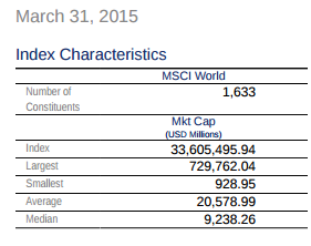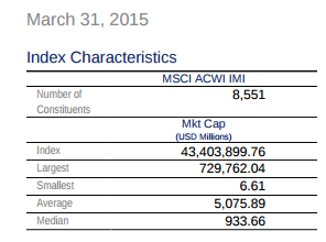 HelloWorld April 25, 2015 Ich hätte gern sowas wie den MSCI ACWI - aber marktkapitalisierungsgewichtet. Welcher wäre das? MSCI ACWI MSCI ACWI IMI (inklusive SC) Danke, warum sind bei beiden Indizes GOOGLE nicht in den TopTen Holdings? Und kann ich aus dem 2% anteil von Apple schließen dass der gesamte Weltaktienmarkt nur eine Markkapitalisierung von ca 12 Bio € hat? Diesen Beitrag teilen Link zum Beitrag