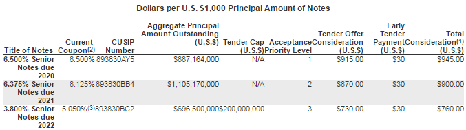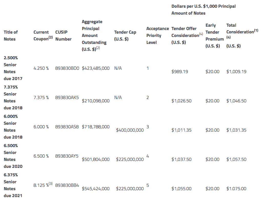 Ramstein Juni 14, 2017 Von Transocean gibt es eine Tender Offer für die 17er bis 21er Anleihen; den Frühtenderaufschlag gibt es bis 26.6. Ich erwäge, meine 21er anzubieten. Diesen Beitrag teilen Link zum Beitrag