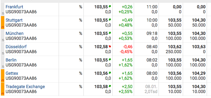 chaosmaker85 Juli 6, 2016 Es wird getendert, vgl. Link Ich halte eine Position in der 2021er, der Rückkauf beträgt hier inkl. Early Tender Payment 90%. Das wäre schon in Ordnung, andrerseits ist ein USD Kupon von über 8% auch nicht zu verachten. Unabhängig davon frage ich mich, ob die DiBa das rechtzeitig hinkriegen würde Diesen Beitrag teilen Link zum Beitrag