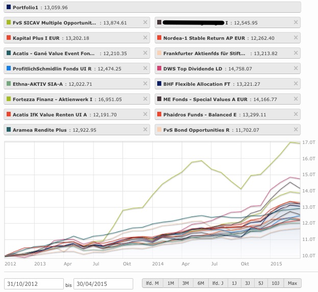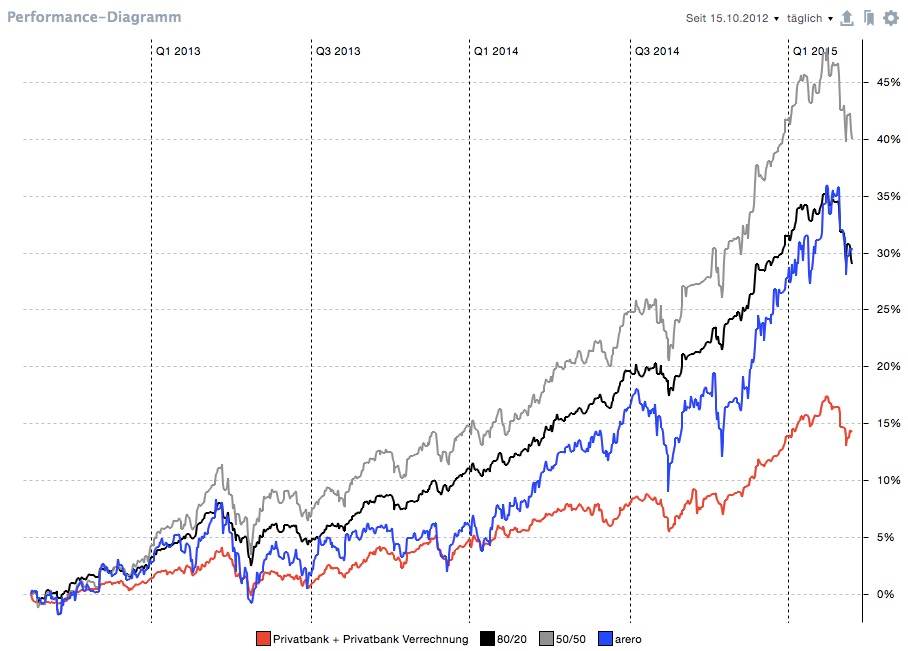 Warambuffet Mai 13, 2015 Nach den vielen Diskussionen über Kosten und Nutzen von Vermögensverwaltern in den letzten Tagen habe ich mir die Mühe gemacht und echte Daten in Bennerichs Portfolio Performance zum Vergleich importiert. Das Depot wurde im Oktober 2012 eröffnet und seither sind unregelmäßige Auszahlungen erfolgt. Zum Vergleich der Performance habe ich die 2012 von der Stiftung Warentest empfohlenen Fonds für zwei simple ETF-Depots (Stichwort Pantoffeldepot) a) 80 % db x-trackers II iBoxx EUR Sovereign, LU0290355717 und 20% db x-trackers MSCI World EU SM 1, LU0274208692 b) 50 % db x-trackers II iBoxx EUR Sovereign, LU0290355717 und 50 % db x-trackers MSCI World EU SM 1, LU0274208692 mit gleichen Kauf und Verkaufszeitpunkten erfasst. Zusätzlich habe ich das noch mit dem Arero Fonds (LU0360863863) gemacht Das Diagramm zeigt das Vermögensverwaltungs-Ergebnis einer Privatbank mit der höchsten Auszeichung des Elite-Reports 2012. Sicherlich ist das schlechtere Ergebnis auf die Verwaltungs-Gebühren, die teueren aktiven Produkte, die hohen Performance-Fees sowie den verschenkten Steuerstundungseffekt durch die vielen (unnötigen?) Umschichtungen zurückzuführen. Gerne kann ich andere Zeitfenster präsentieren. Diesen Beitrag teilen Link zum Beitrag